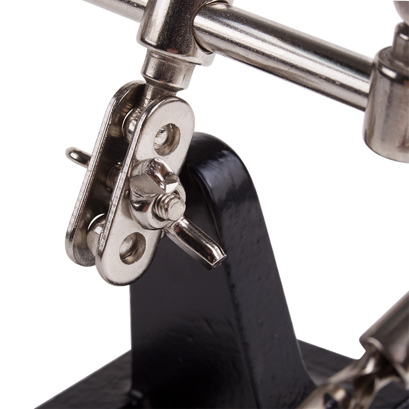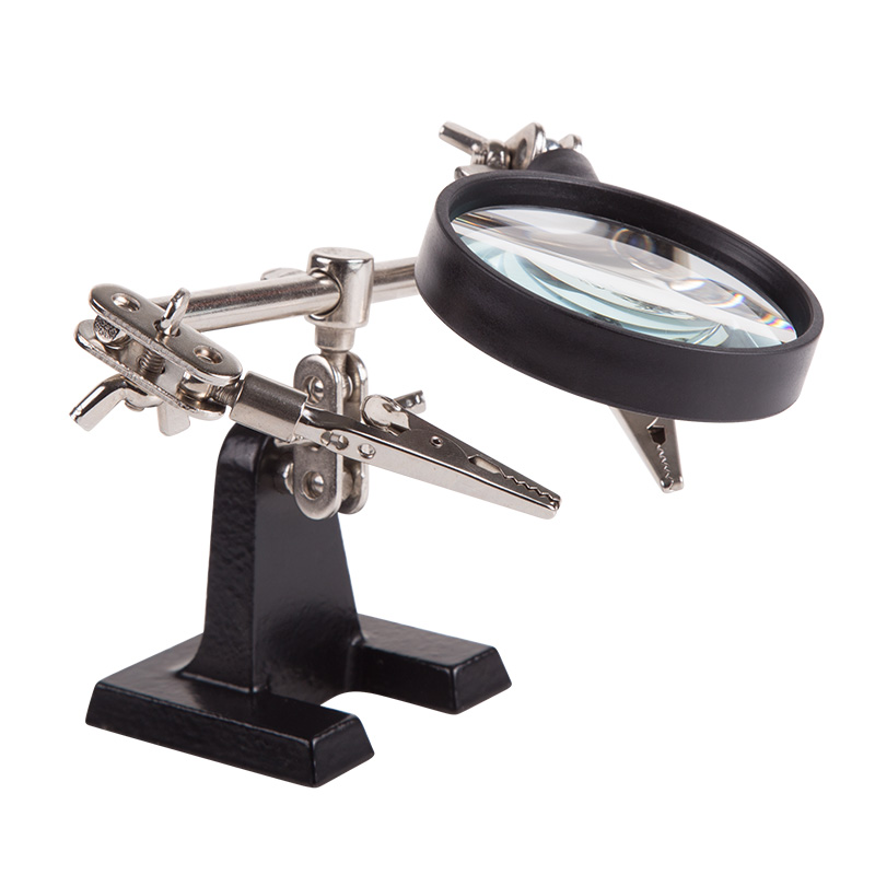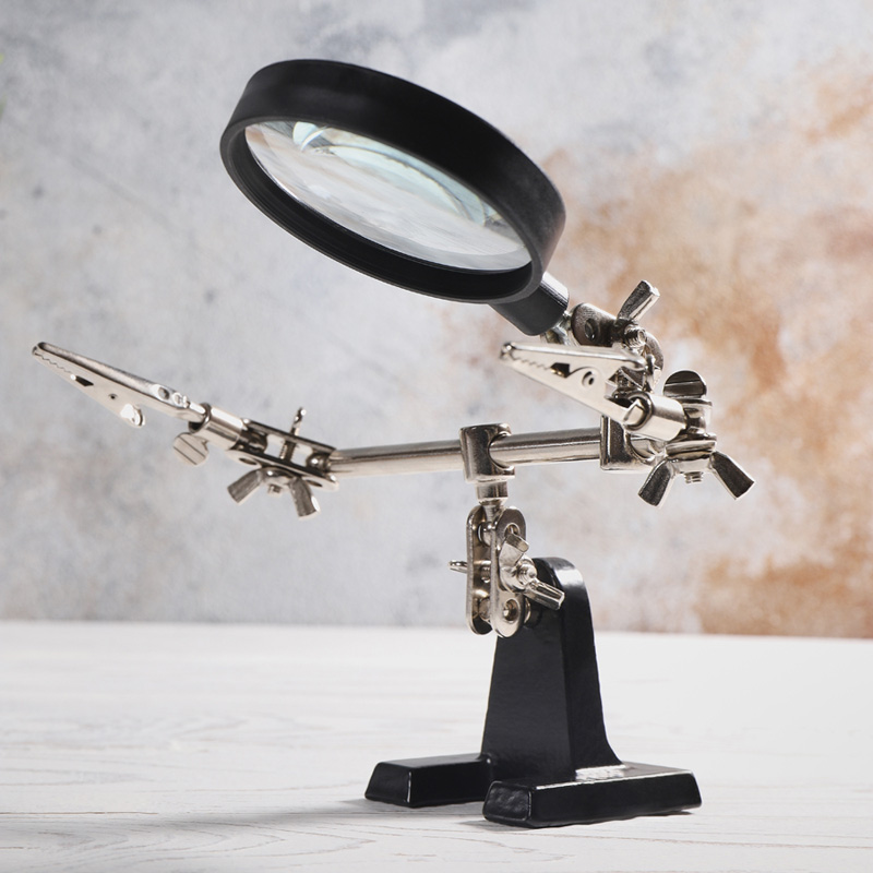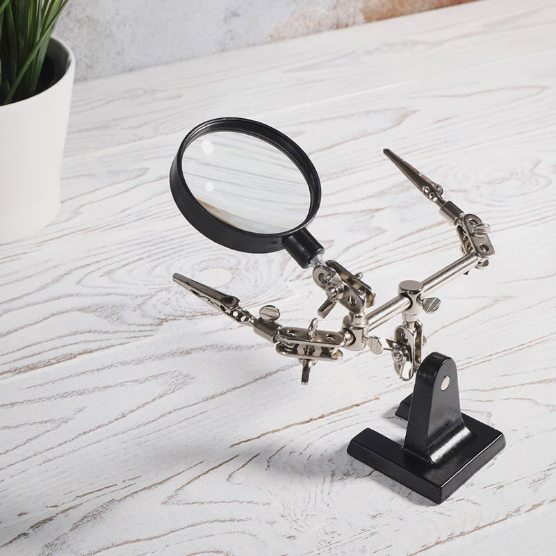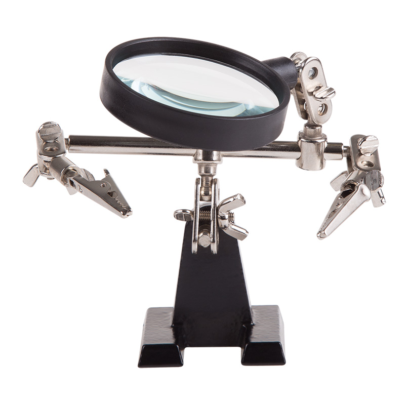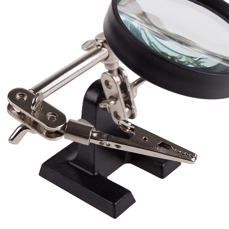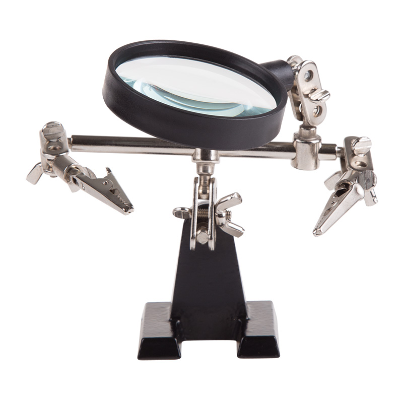 Держатель «третья рука» с лупой х2.5 REXANT служит, главным образом, при проведении паяльно-сборочных работ в электронике, ювелирном деле, сборке и ремонте для зажима мелких деталей в любом нужном положении, когда не хватает двух рук.