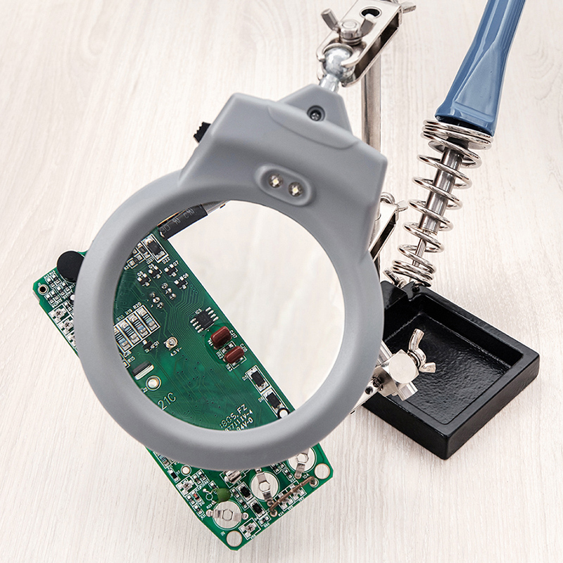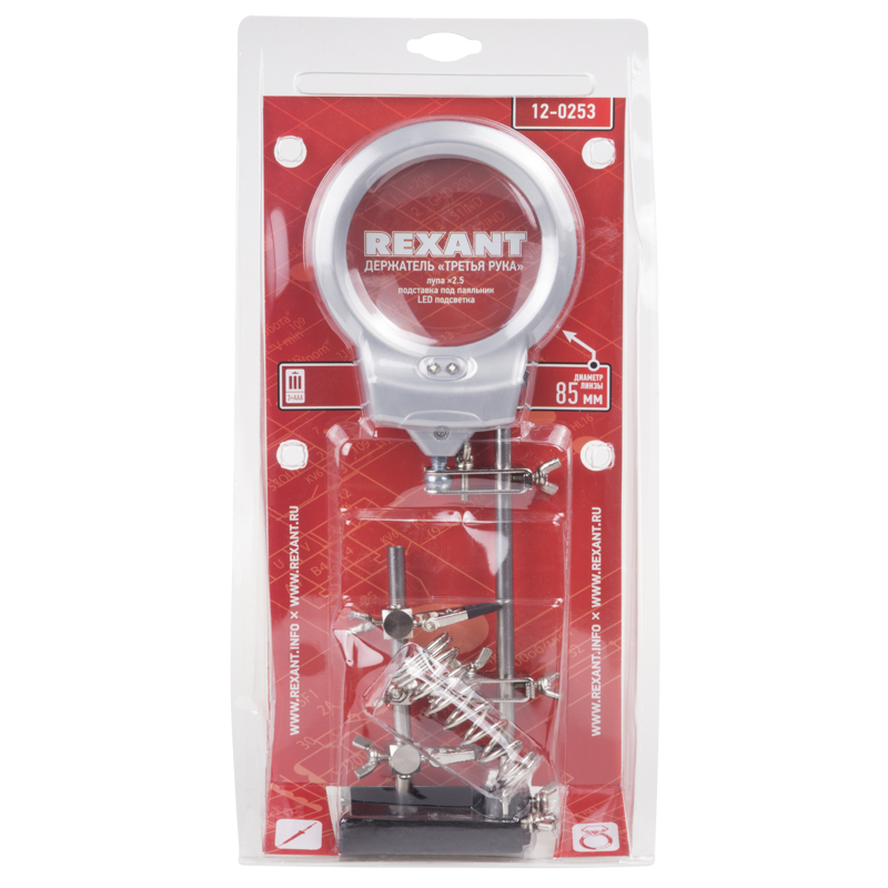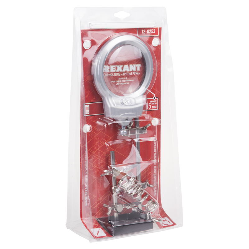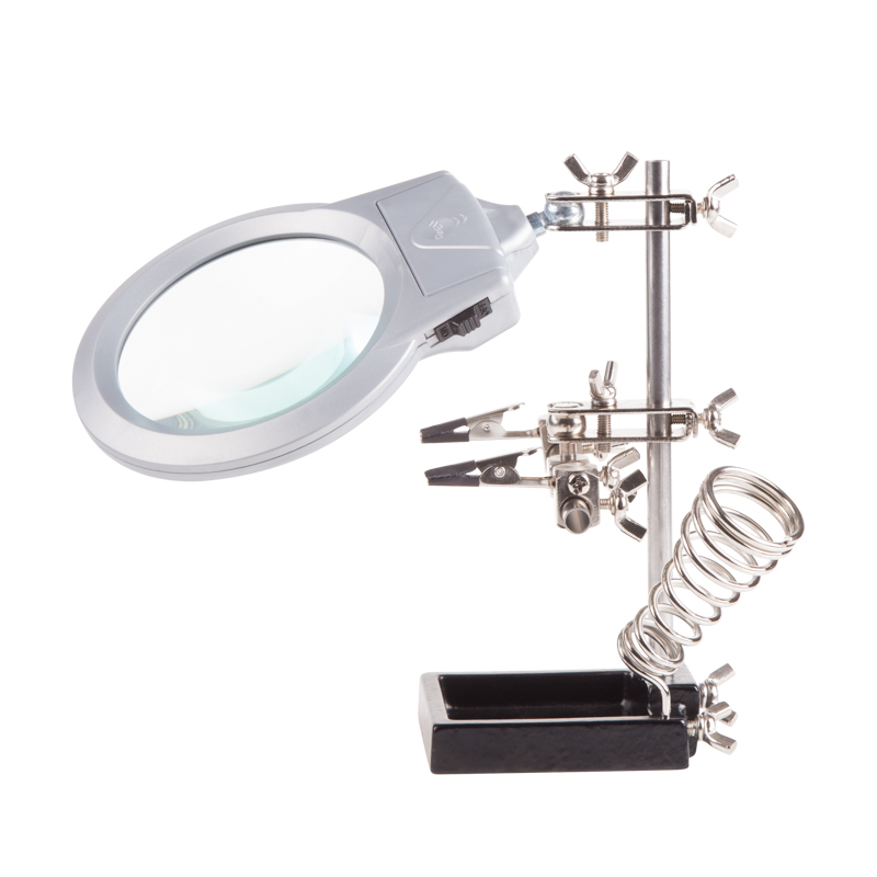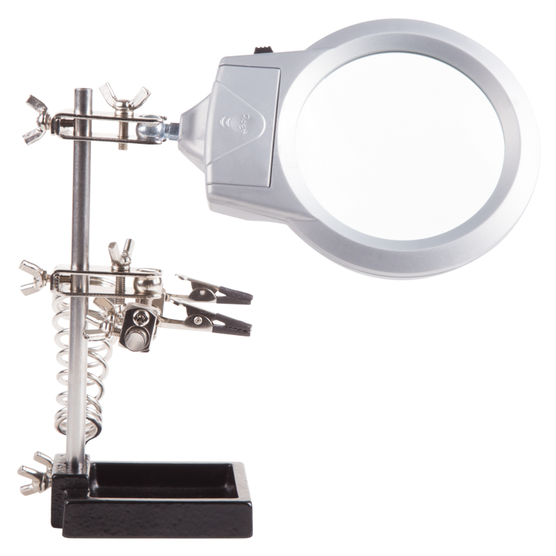 Держатель «третья рука» с подставкой под паяльник и лупой х2.5 с LED подсветкой REXANT служит главным образом при проведении паяльно-сборочных работ в электронике, ювелирном деле, сборке и ремонте для зажима мелких деталей в любом нужном положении, когда не хватает двух рук.