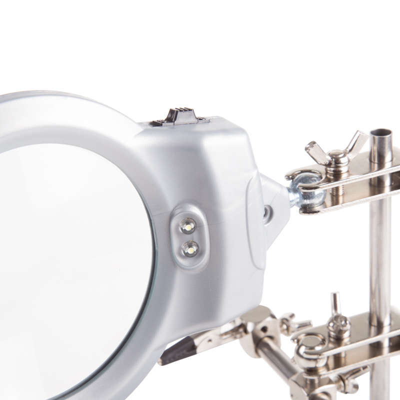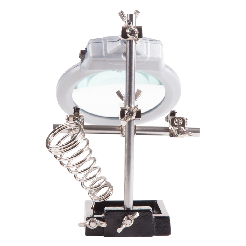 Инструмент состоит из чугунного основания (тяжелая подставка с нишей для мелких деталей или припоя), двух подвижных зажимов типа «крокодил» с никелевым покрытием, лупы х2.5 со светодиодной подсветкой (возможность регулировки положения, диаметр линзы 85 мм) и спиралевидной подставки под паяльник с никелевым покрытием.