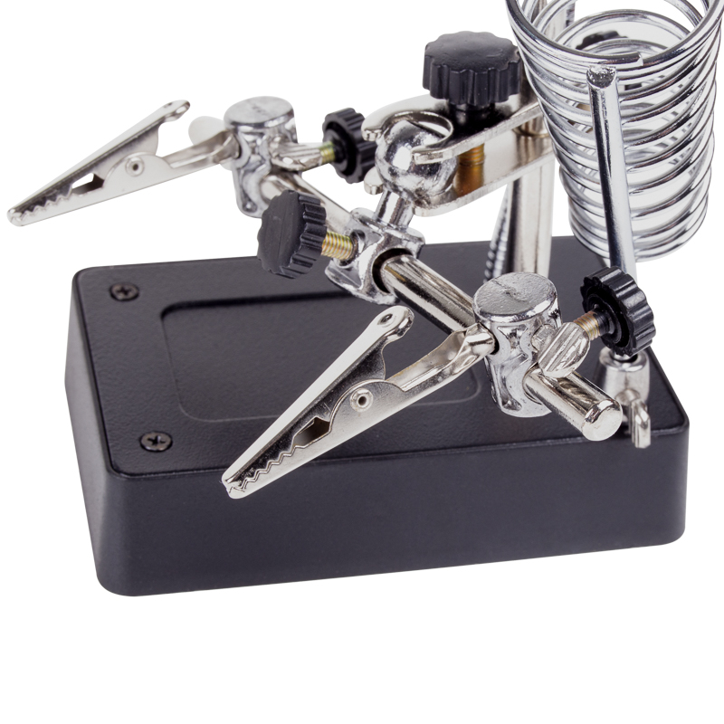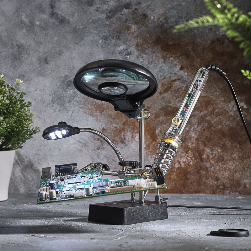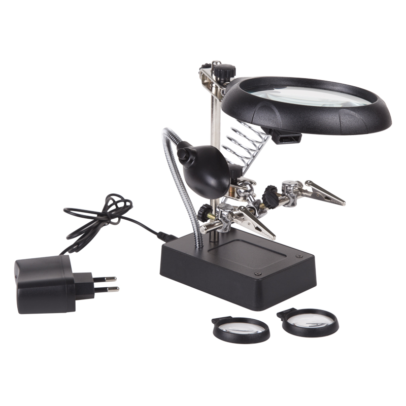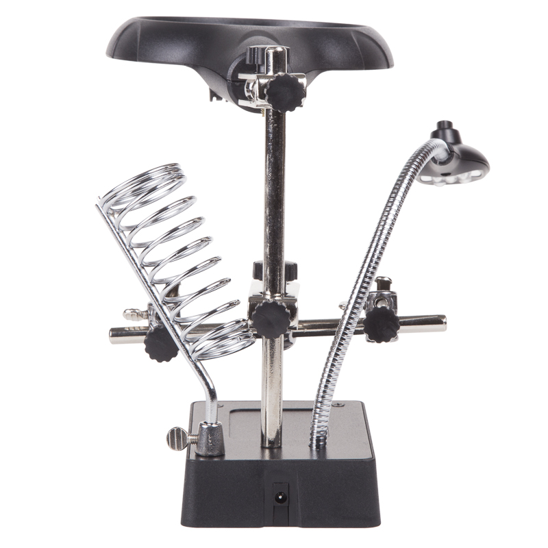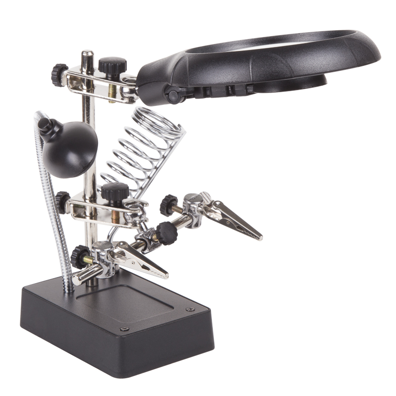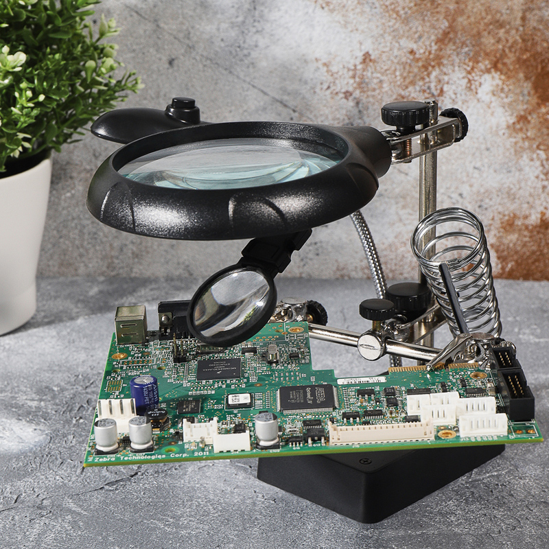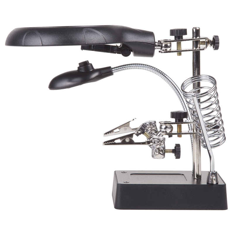 Держатель «третья рука» с лупой х2.5 + х7.5, подставка под паяльник, LED подсветка служит главным образом при проведении паяльно-сборочных работ в электронике, ювелирном деле, сборке и ремонте для зажима мелких деталей в любом нужном положении, когда не хватает двух рук.