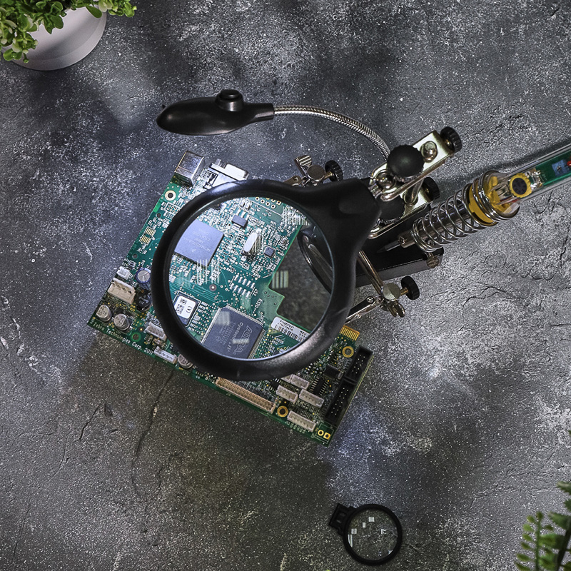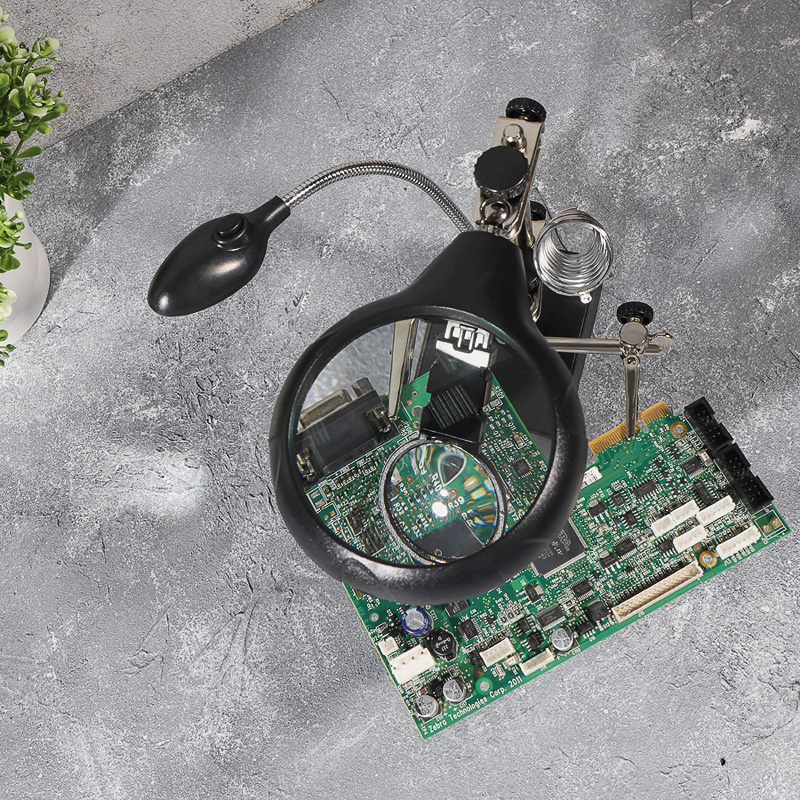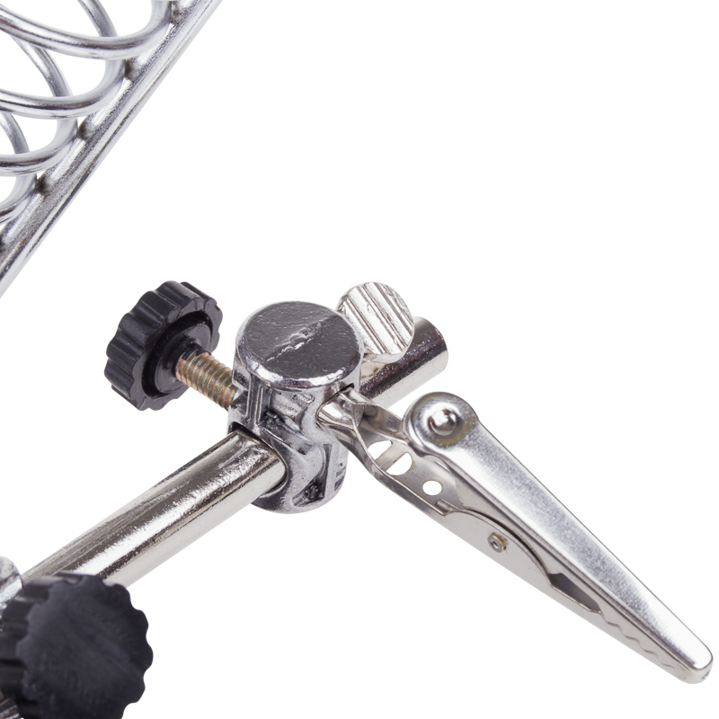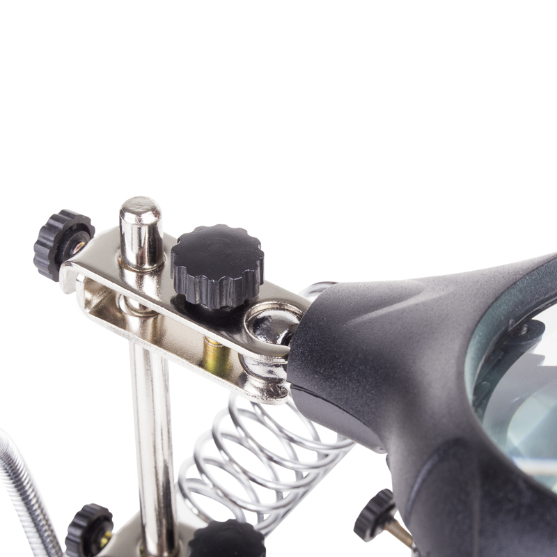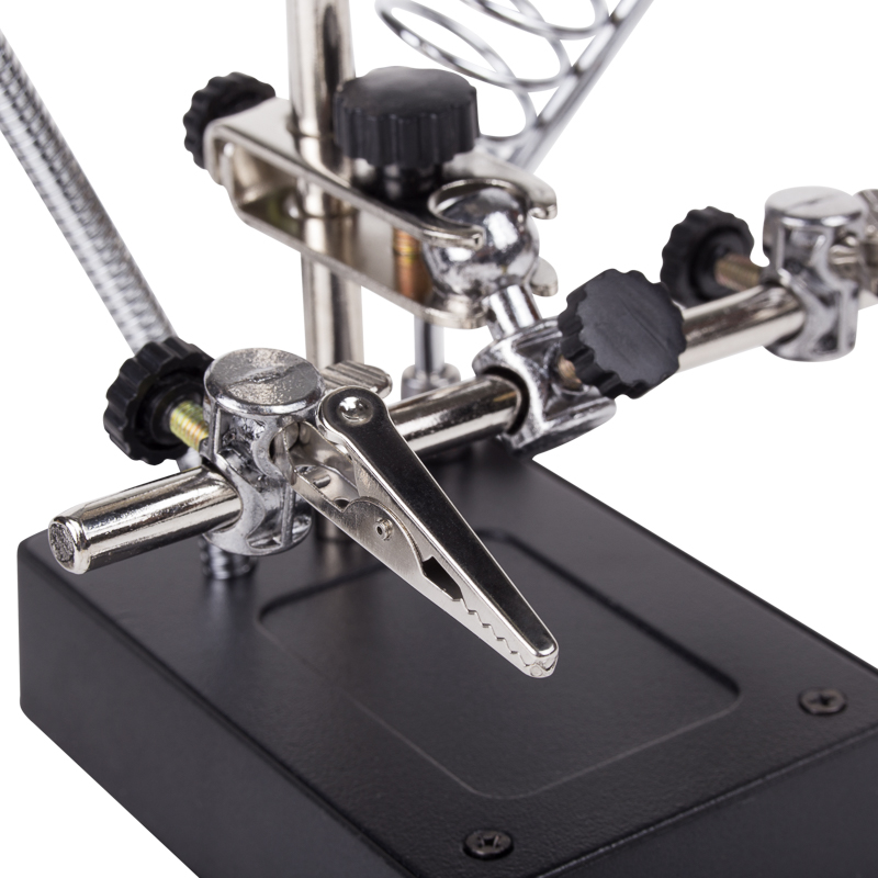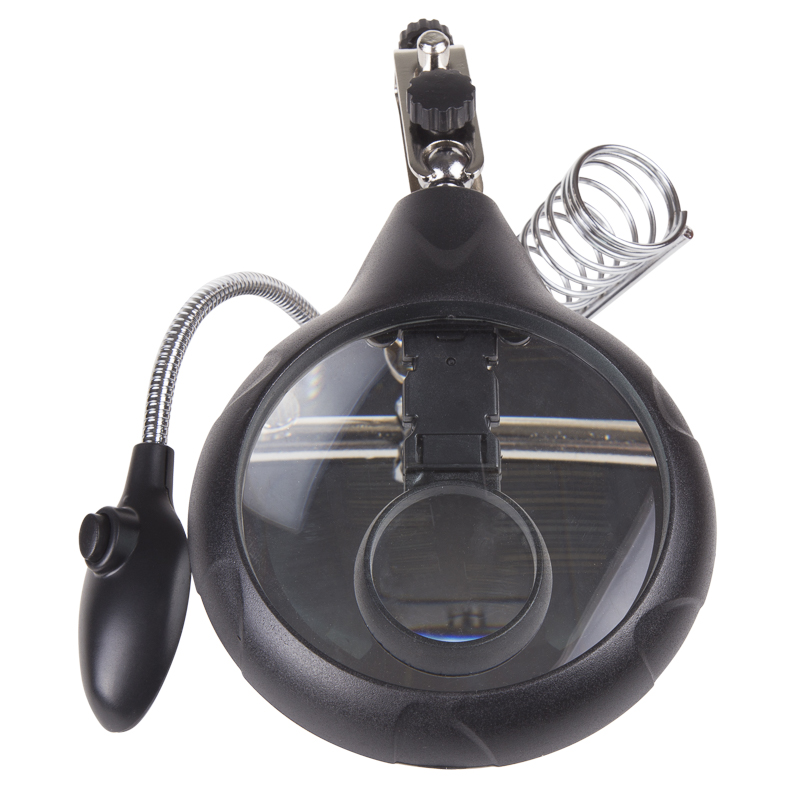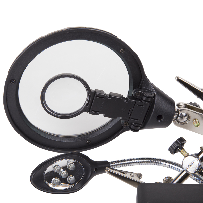 Держатель «третья рука» с лупой х2.5 + х7.5, подставка под паяльник, LED подсветка служит главным образом при проведении паяльно-сборочных работ в электронике, ювелирном деле, сборке и ремонте для зажима мелких деталей в любом нужном положении, когда не хватает двух рук.