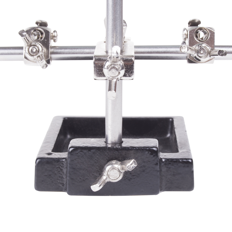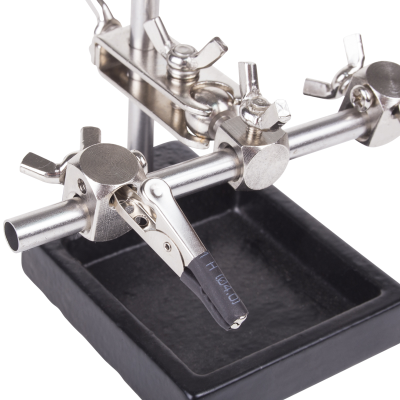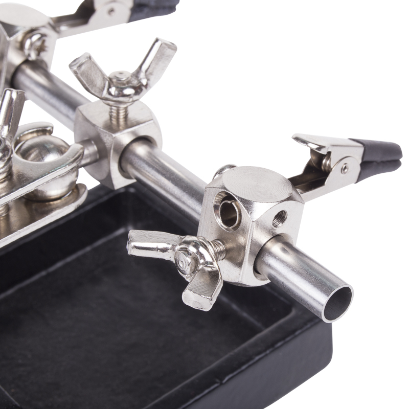 Инструмент состоит из чугунного основания (тяжелая подставка с нишей для мелких деталей или припоя), двух подвижных зажимов типа «крокодил» с никелевым покрытием и лупы с 3-кратным увеличением (возможность регулировки положения, диаметр линзы 90 мм).