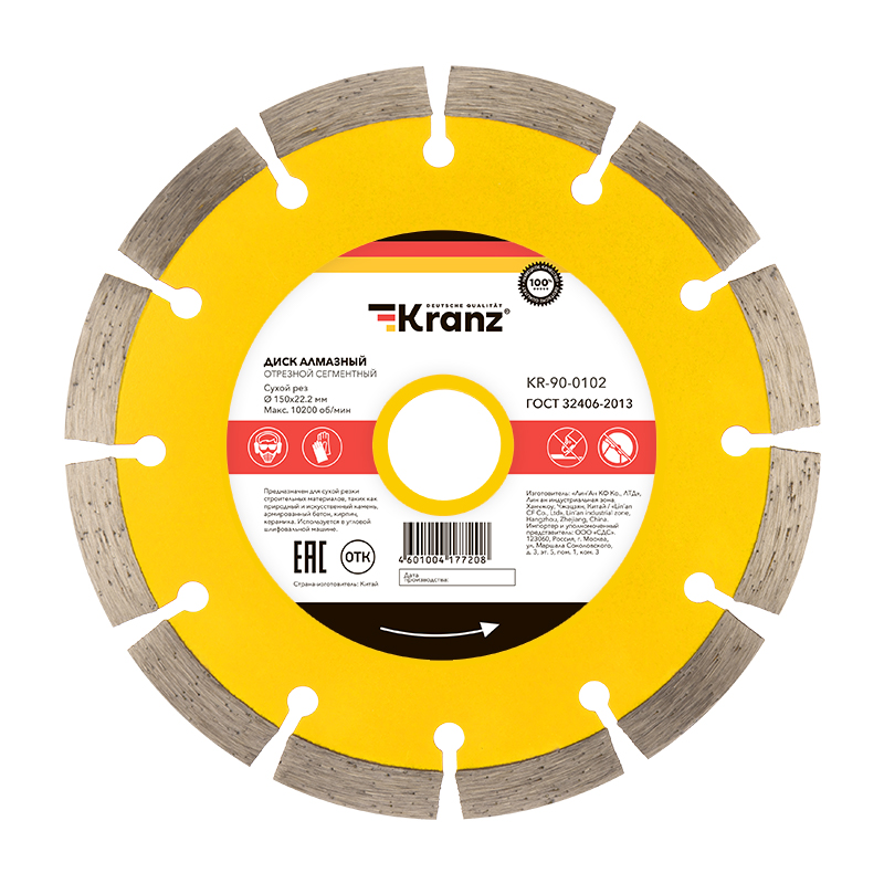 Внимание! Запрещается использовать диск для резки металлов. При установке диска руководствуйтесь стрелкой направления вращения диска. Используйте средства индивидуальной защиты. Не утилизируйте с бытовыми отходами.