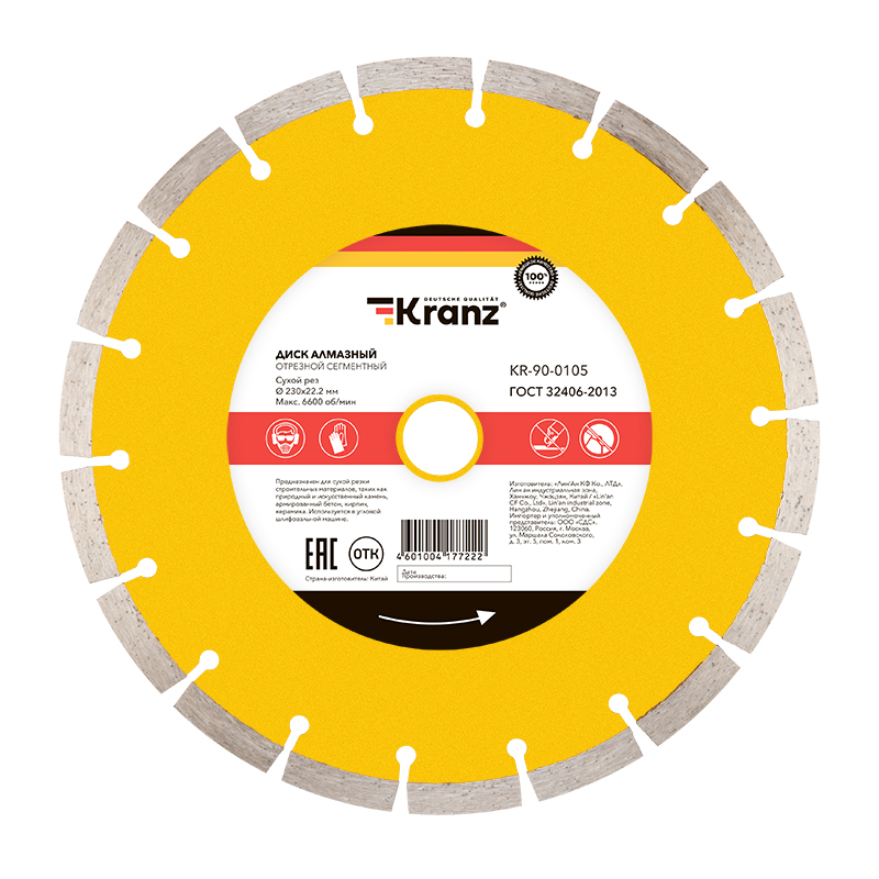Внимание! Запрещается использовать диск для резки металлов. При установке диска руководствуйтесь стрелкой направления вращения диска. Используйте средства индивидуальной защиты. Не утилизируйте с бытовыми отходами.