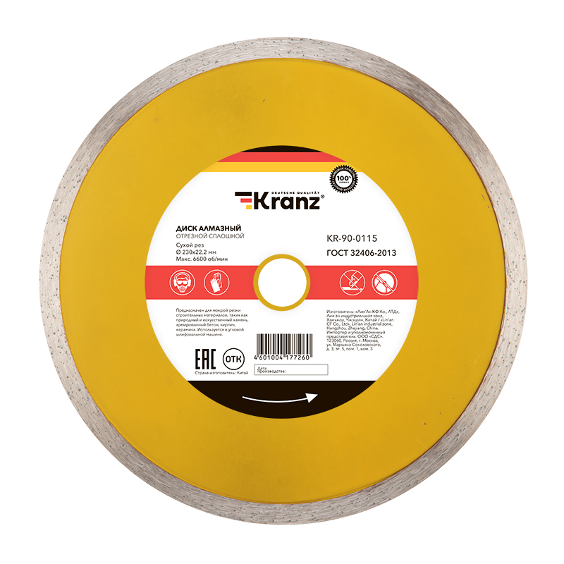 Диск алмазный отрезной сплошной 230x22,2x2,4x10мм KRANZ
