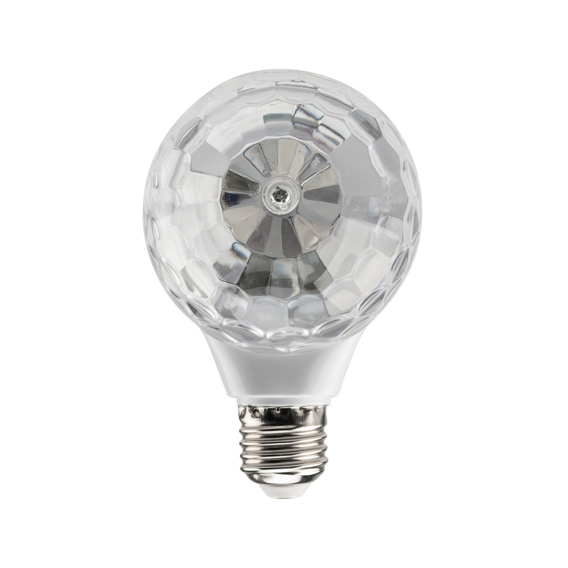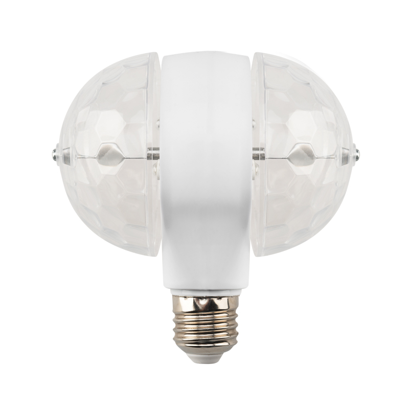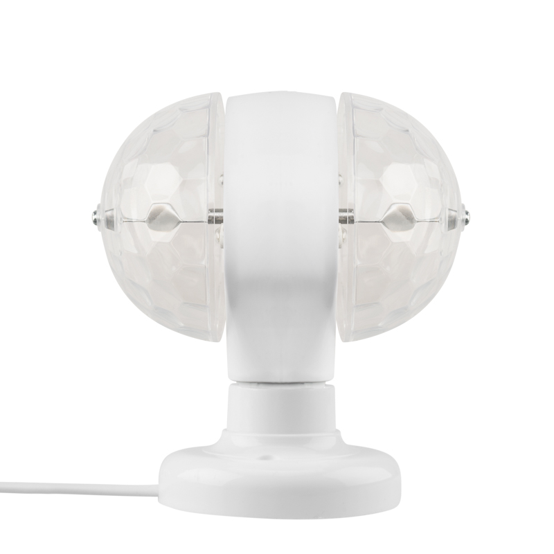 Двойная диско-лампа с цоколем Е27 и подставкой поможет организовать веселую вечеринку где угодно благодаря эффектной светомузыке, которую создают 2 вращающихся модуля со светодиодами RGB. 6 диодов «мультиколор» светятся разноцветными огнями, а вращающиеся купола разносят поток ярких лучей, имитируя работу настоящих диско-систем. Лампу можно вкрутить в люстру, настенный светильник или торшер с подходящим патроном. В комплекте идет настольная подставка, которая подключается к электросети.