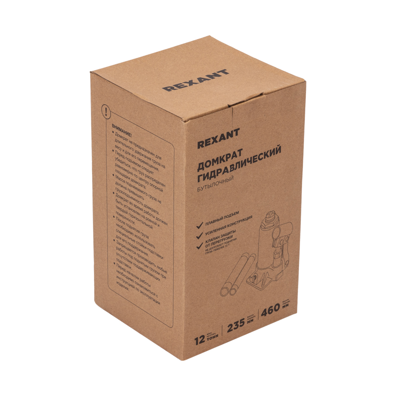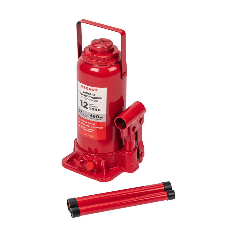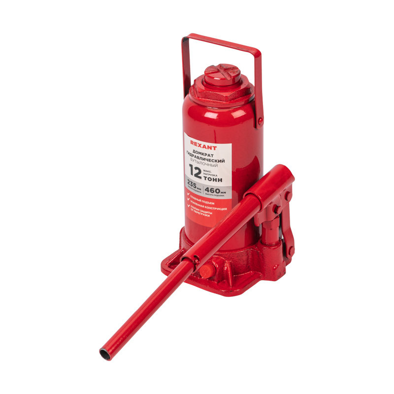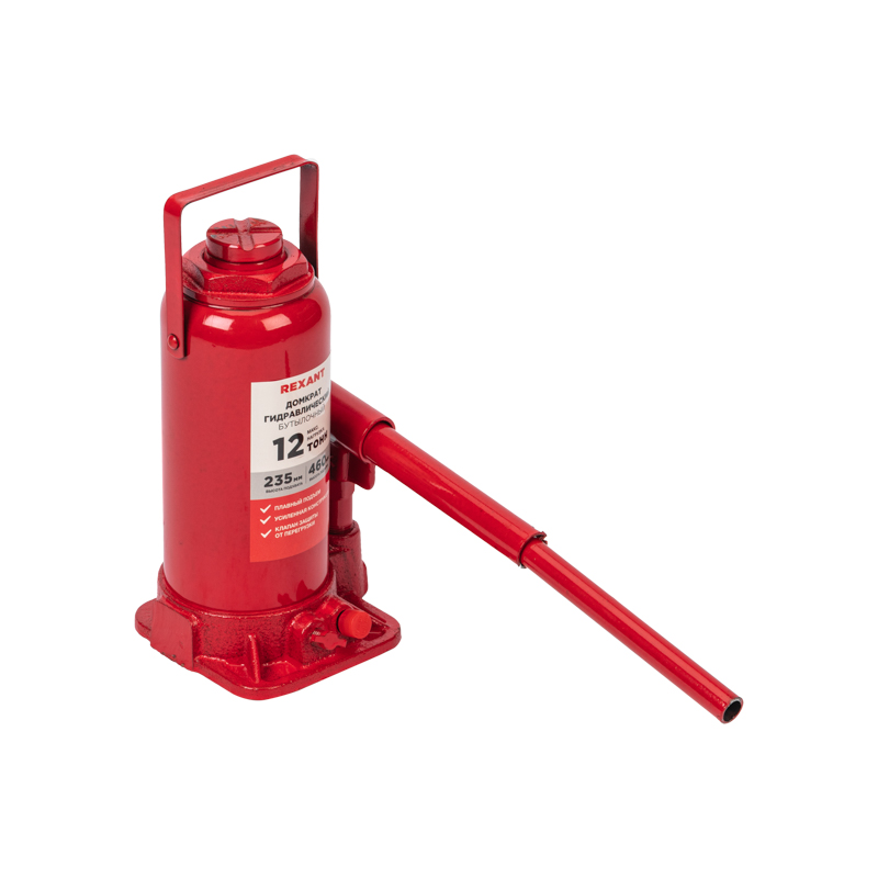 Гидравлический бутылочный домкрат REXANT предназначен для поднятия грузов массой до 12 тонн на высоту до 460 мм. Оптимален для автомобилей с большим клиренсом. Оснащен гидравлической системой, обеспечивающей высокую мощность и надежность.