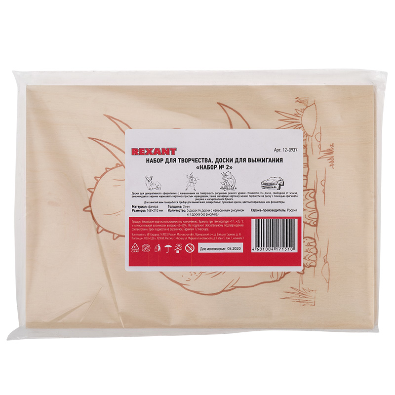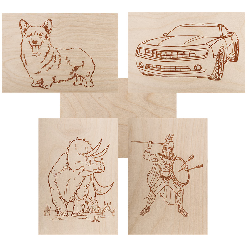 Состав набора № 2: 5 досок для выжигания (4 доски с нанесенными картинками в различной тематике (воин, динозавр, собака, машина) и 1 доска для самостоятельного творчества (без эскиза рисунка).