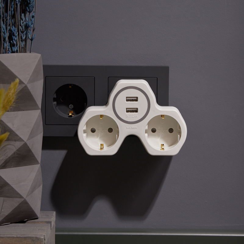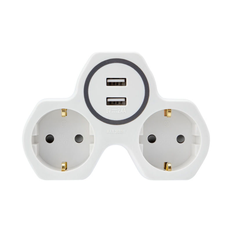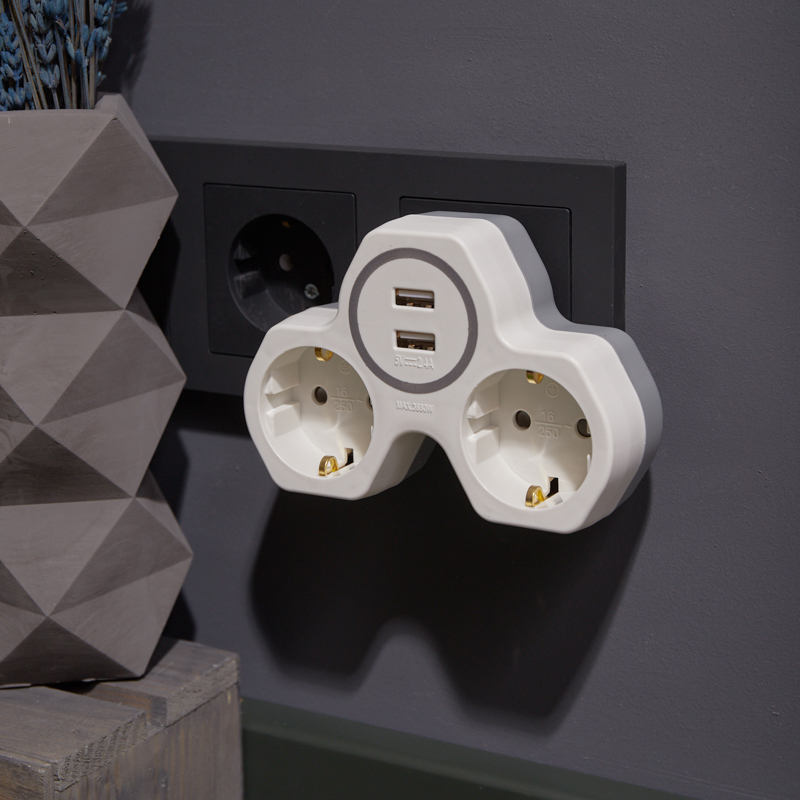 Электрический двойник REXANT предназначен для одновременного подключения к электрическим сетям с напряжением 220 В сразу два прибора со стандартной вилкой и два прибора с USB разъемами питания с максимальной мощностью 2А.