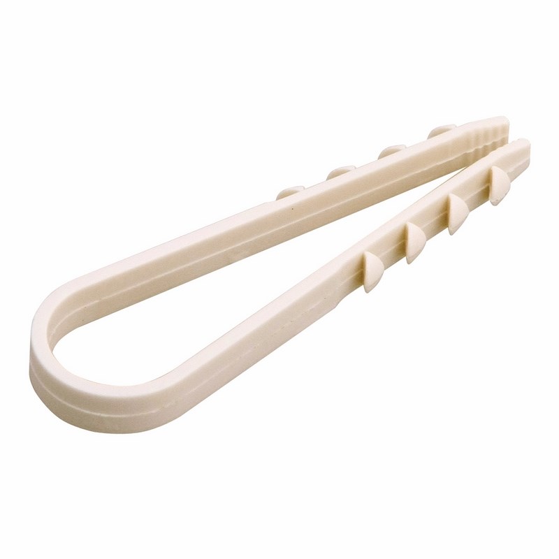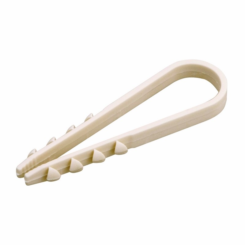 Дюбель-хомут представляет собой крепежное изделие с боковыми шипами и петлей для удержания кабеля. За счет шипов дюбель легко фиксируется в отверстии, но для его извлечения понадобится приложить усилие. Важно: для надежной фиксации дюбеля необходимо соблюдать точные параметры при сверлении отверстия, а для этого желательно использовать новую оснастку, которая не успела износиться. Дюбель может быть установлен в бетон, кирпич, дерево, газобетон и природный камень. Морозостойкие добавки добавляют крепежу устойчивость к низким температурам и позволяют использовать его на улице или в неотапливаемых помещениях.