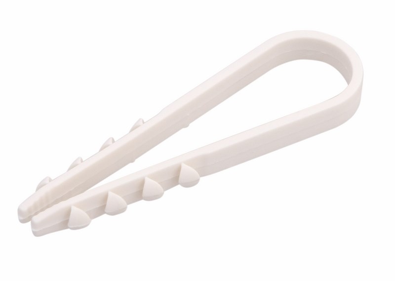 Дюбель-хомут представляет собой крепежное изделие с боковыми шипами и петлей для удержания кабеля. За счет шипов дюбель легко фиксируется в отверстии, но для его извлечения понадобится приложить усилие. Важно: для надежной фиксации дюбеля необходимо соблюдать точные параметры при сверлении отверстия, а для этого желательно использовать новую оснастку, которая не успела износиться. Дюбель может быть установлен в бетон, кирпич, дерево, газобетон и природный камень. Морозостойкие добавки добавляют крепежу устойчивость к низким температурам и позволяют использовать его на улице или в неотапливаемых помещениях.