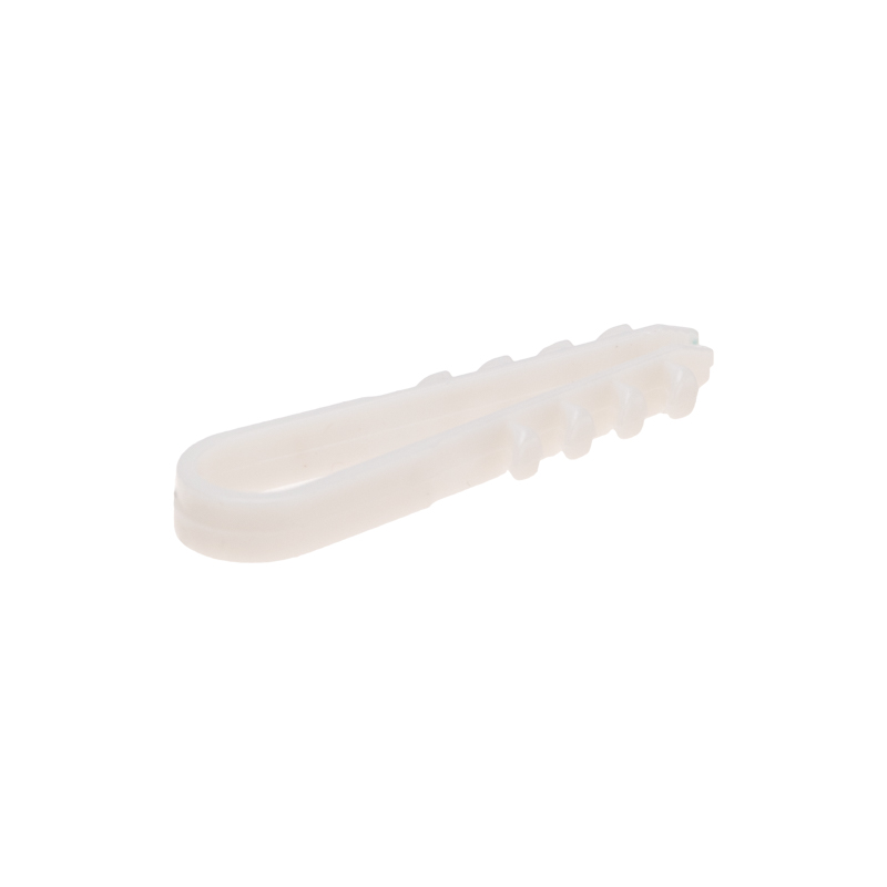Дюбель-хомут представляет собой крепежное изделие с боковыми шипами и петлей для удержания кабеля. За счет шипов дюбель легко фиксируется в отверстии, но для его извлечения понадобится приложить усилие. Важно: для надежной фиксации дюбеля необходимо соблюдать точные параметры при сверлении отверстия, а для этого желательно использовать новую оснастку, которая не успела износиться. Дюбель может быть установлен в бетон, кирпич, дерево, газобетон и природный камень. Морозостойкие добавки добавляют крепежу устойчивость к низким температурам и позволяют использовать его на улице или в неотапливаемых помещениях.