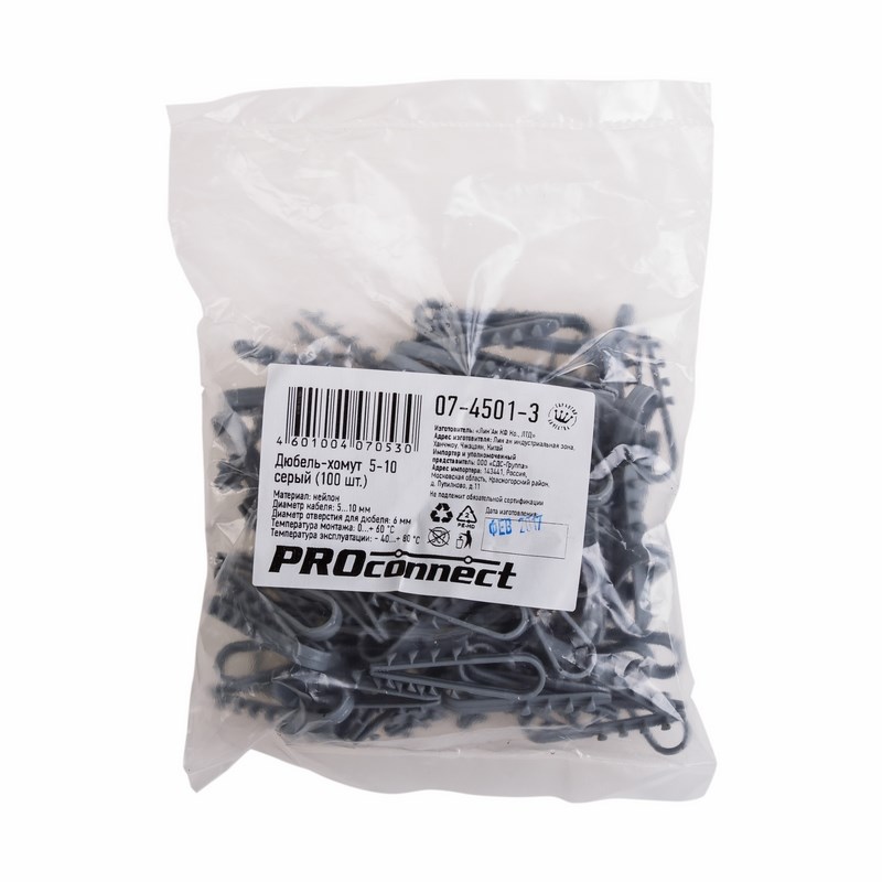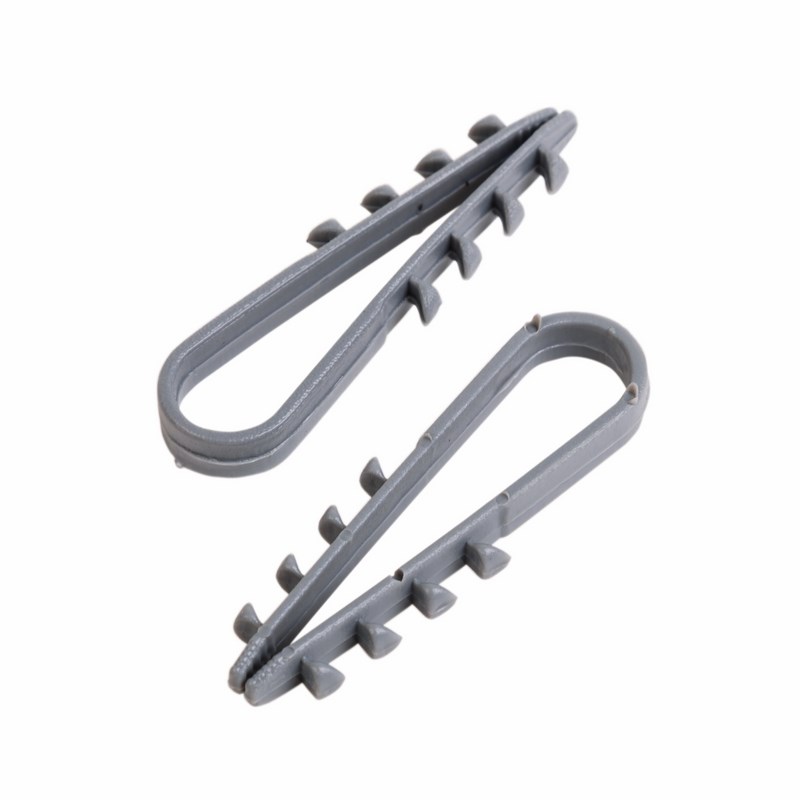 Дюбель-хомут представляет собой крепежное изделие с боковыми шипами и петлей для удержания кабеля. За счет шипов дюбель легко фиксируется в отверстии, но для его извлечения понадобится приложить усилие. Важно: для надежной фиксации дюбеля необходимо соблюдать точные параметры при сверлении отверстия, а для этого желательно использовать новую оснастку, которая не успела износиться. Дюбель может быть установлен в бетон, кирпич, дерево, газобетон и природный камень. Морозостойкие добавки добавляют крепежу устойчивость к низким температурам и позволяют использовать его на улице или в неотапливаемых помещениях.