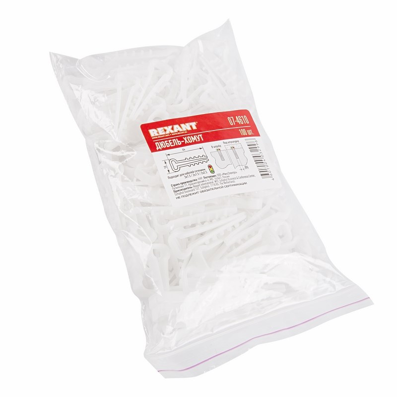 В упаковке 100 дюбель-хомутов белого цвета.