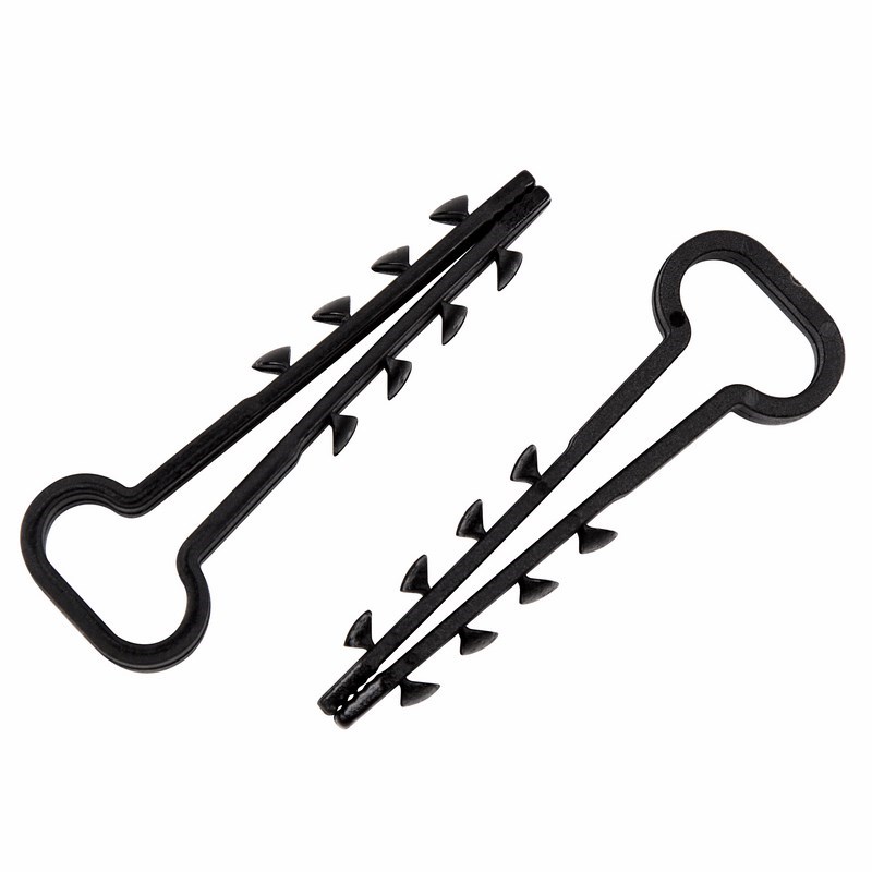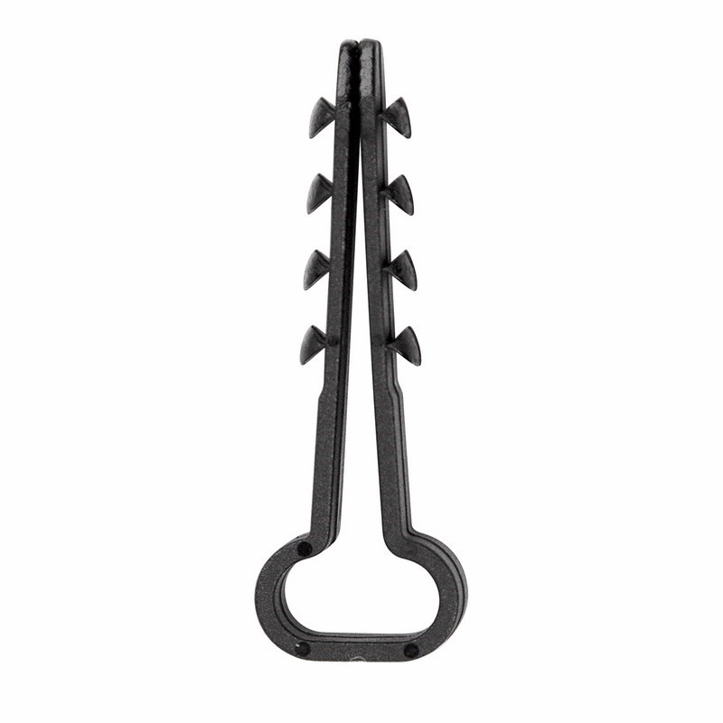 Дюбель-хомут представляет собой крепежное изделие с петлей для удержания кабеля и уникальной системой боковых шипов типа «елочка». Благодаря шипам крепеж легко вставляется в отверстие и не выпадает, а для извлечения такого дюбеля понадобятся плоскогубцы. Важно: для надежной фиксации дюбеля необходимо соблюдать точные параметры при сверлении отверстия, а для этого желательно использовать новую оснастку, которая не успела износиться. Дюбель может быть установлен в бетон, кирпич, газобетон и природный камень. Морозостойкие добавки добавляют крепежу устойчивость к низким температурам и позволяют использовать его на улице или в неотапливаемых помещениях.
