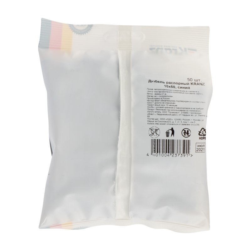 Дюбель распорный 10х50мм, синий, полипропилен, пакет (50 шт/уп) KRANZ
