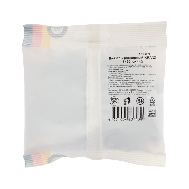 Дюбель распорный 6х50мм, синий, полипропилен, пакет (50 шт/уп) KRANZ