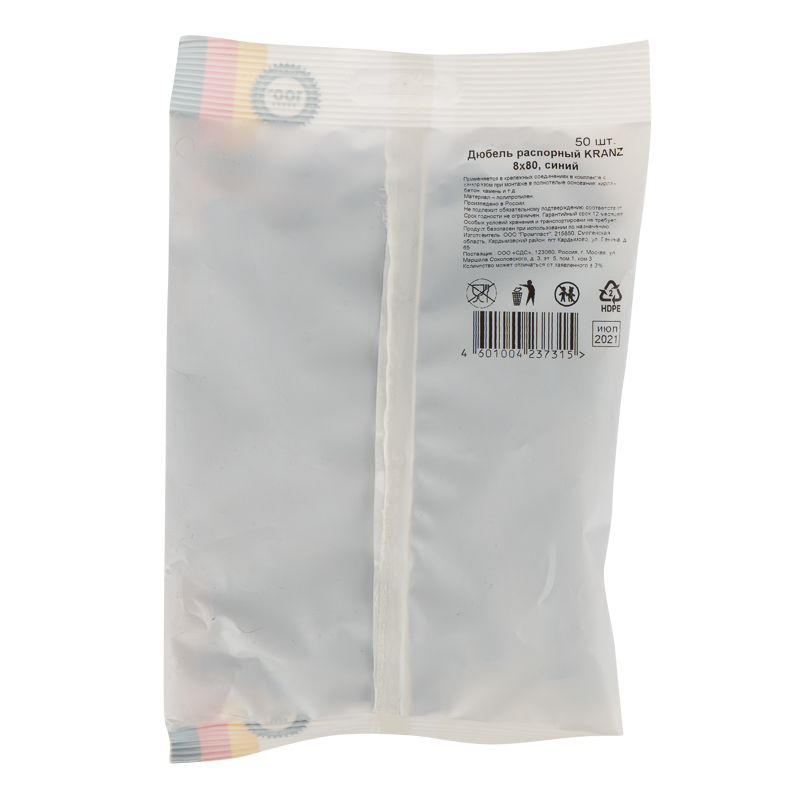 Дюбель распорный 8х80мм, синий, полипропилен, пакет (50 шт/уп) KRANZ