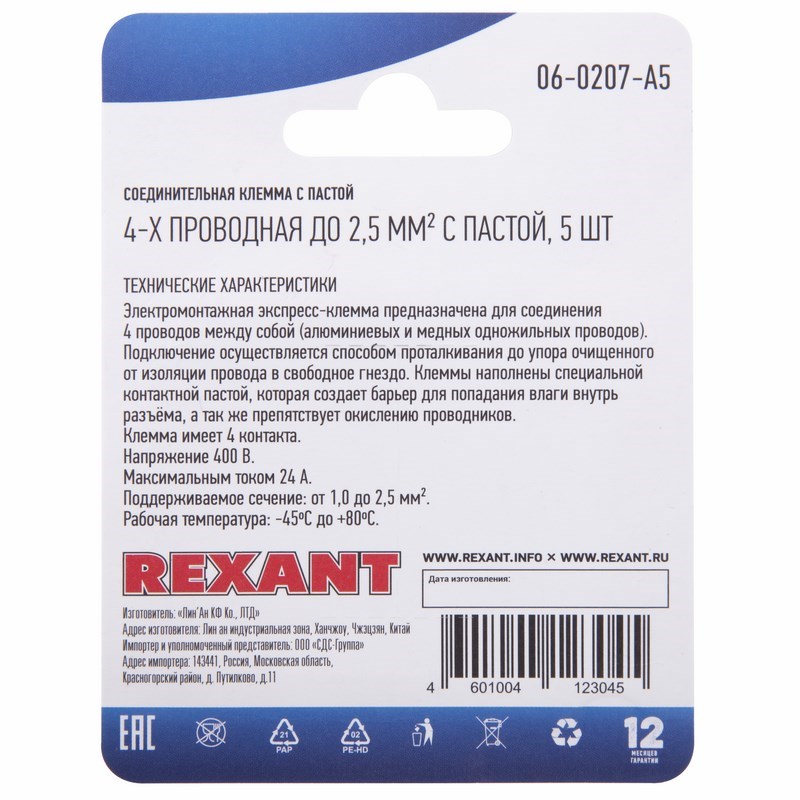 Поддерживаемое сечение: от 1,0 до 2,5 мм2.