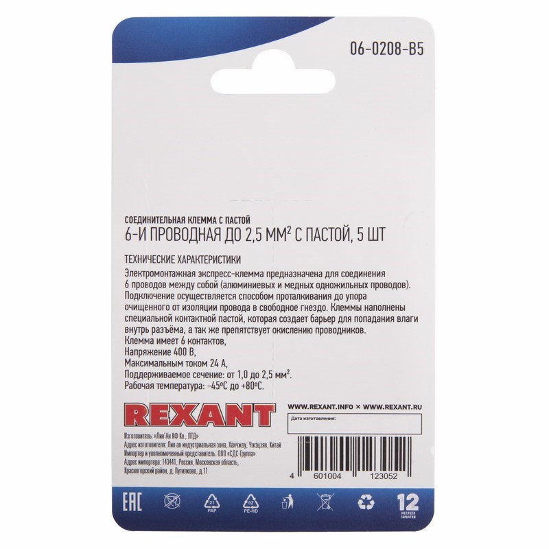 Поддерживаемое сечение: от 1,0 до 2,5 мм2.