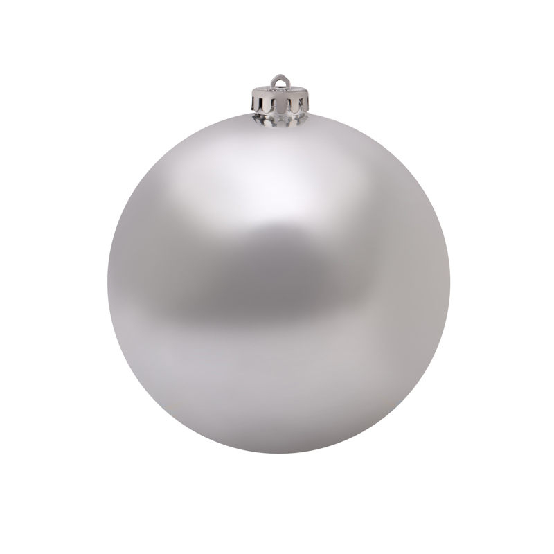 Данный шар имеет диаметр 15 см, цвет серебряный глянцевый, выполнен из пластика.