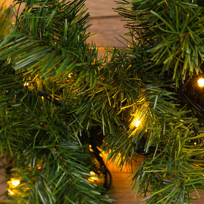 Каждая еловая ветка в гирлянде тщательно выполнена с большим вниманием к деталям, что создает естественный и реалистичный вид хвои. Густота веток и их натуральная форма придают гирлянде объемный и роскошный вид. Диаметр гирлянды составляет 26 см.