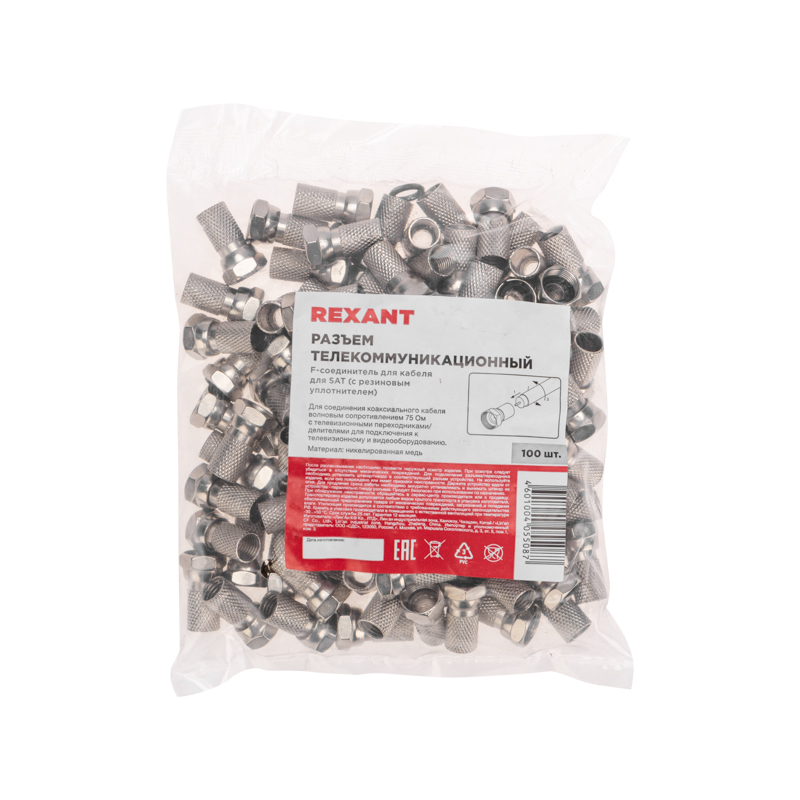 F-разъем для SAT REXANT применяется при подключении видеосистем, кабельного и эфирного телевидения. Предназначен для соединения коаксиального кабеля волновым сопротивлением 75 Ом с телевизионным и видеооборудованием: ресиверы, телевизоры, всевозможная видеоаппаратура и т. д. Подходит для кабелей типа RG-6, и других коаксиальных кабелей (SAT-50, SAT-703, DG-113) имеющих наружный диаметр около 6,8 мм.