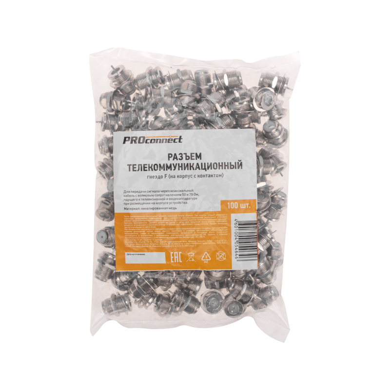 F-разъем на корпус с контактом PROconnect предназначен для передачи сигнала через коаксиальный кабель c волновым сопротивлением 50 и 75 Ом, идущий к телевизионной и видеоаппаратуре.
