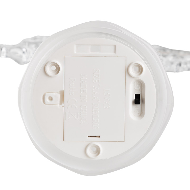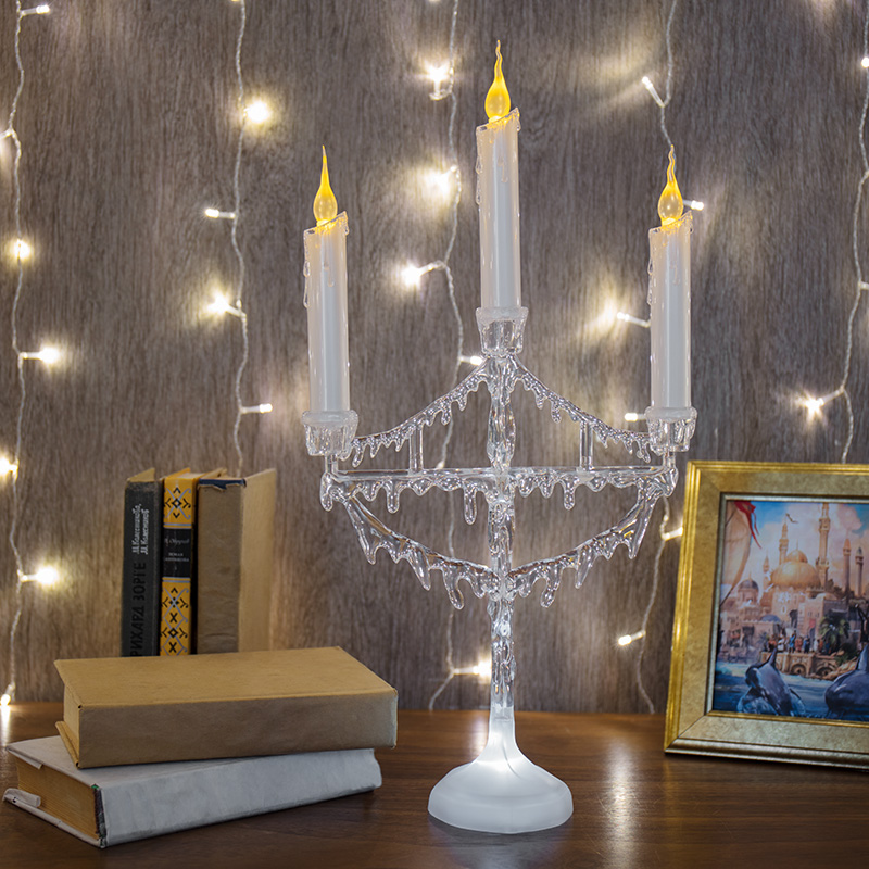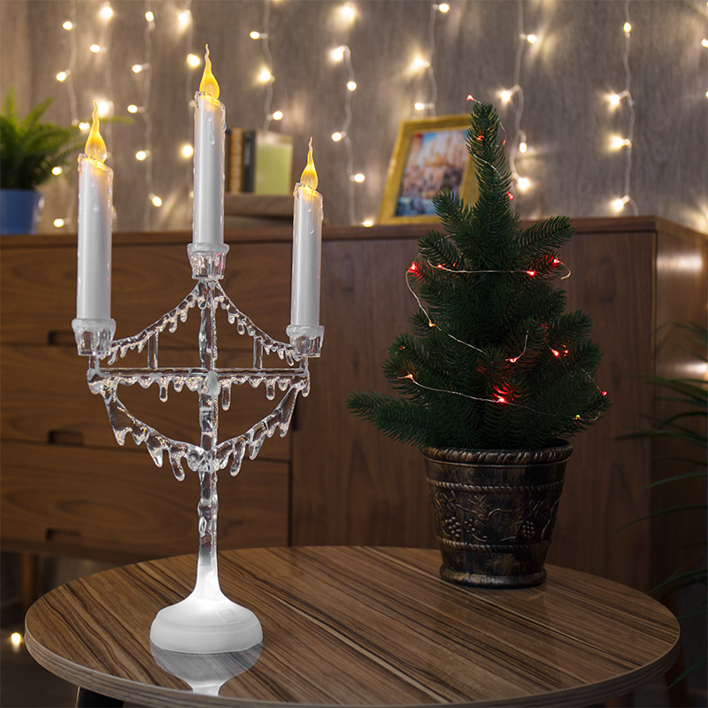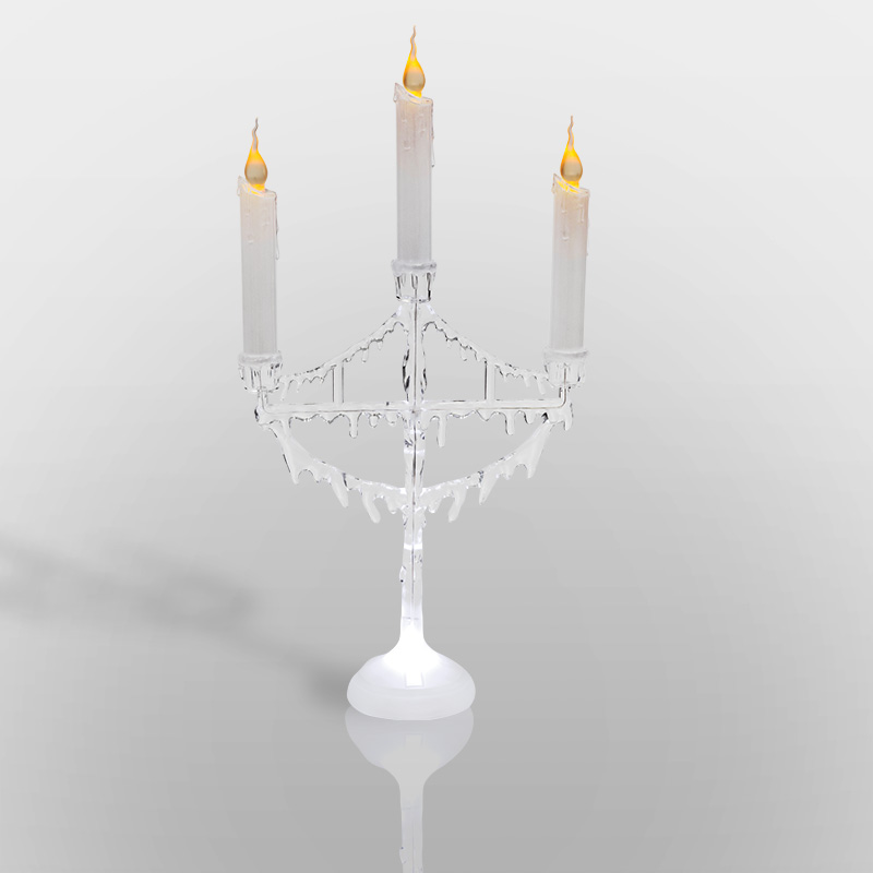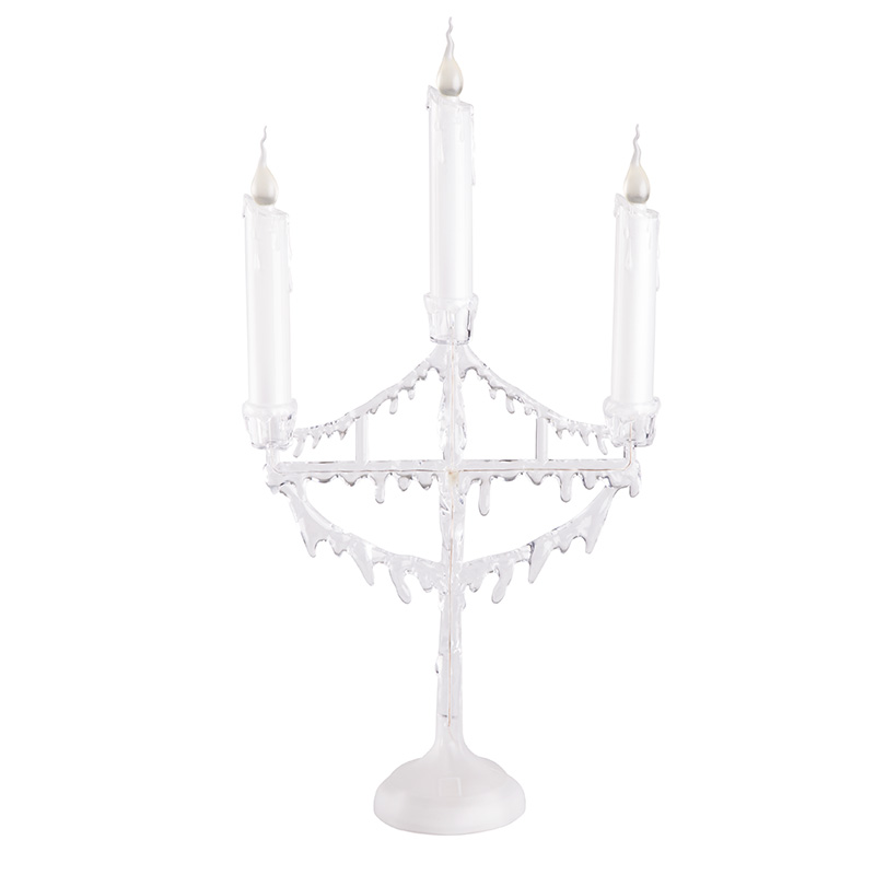 Фигура на подставке «Подсвечник со свечками» высотой 50 см — эффектный интерьерный декор, который не только гармонично украсит обстановку, но и станет полноценным функциональным предметом. 1 белый и 3 желтых светодиода создают эффект плавно движущегося огня на кончике фитилей. Питание от 3 мизинчиковых батареек (типа ААА). Композиция выполнена из белого и прозрачного пластика в виде подсвечника с 3 декоративными свечами. В нижней части подставки расположены батарейный модуль и кнопка ON/OFF.