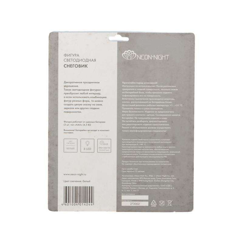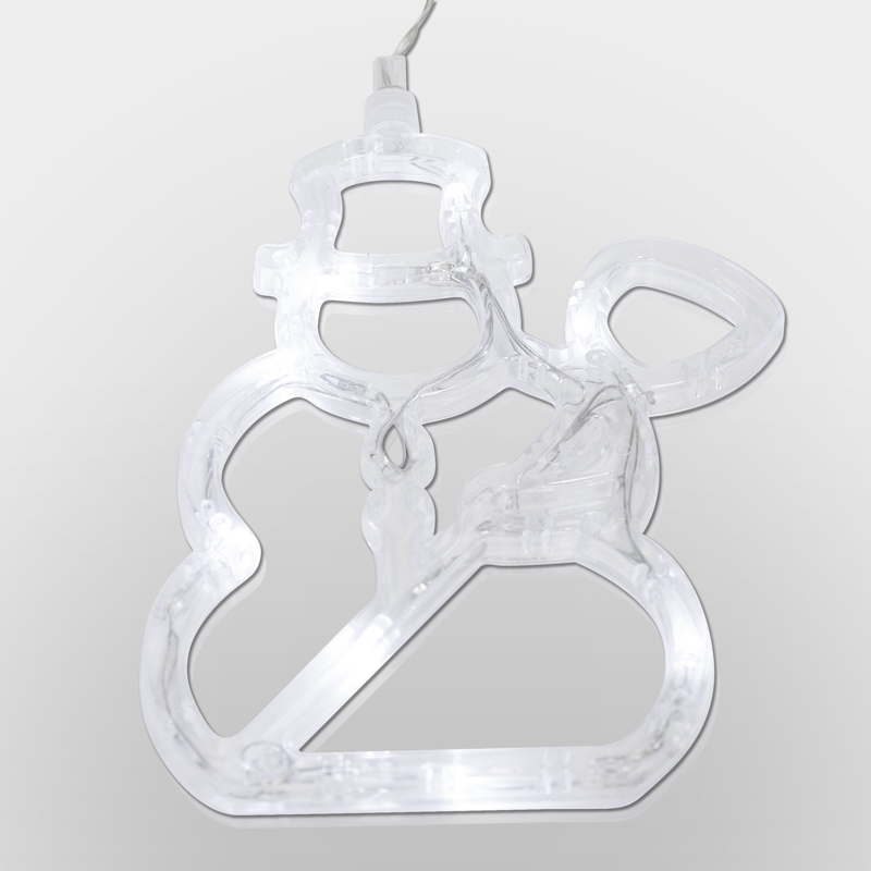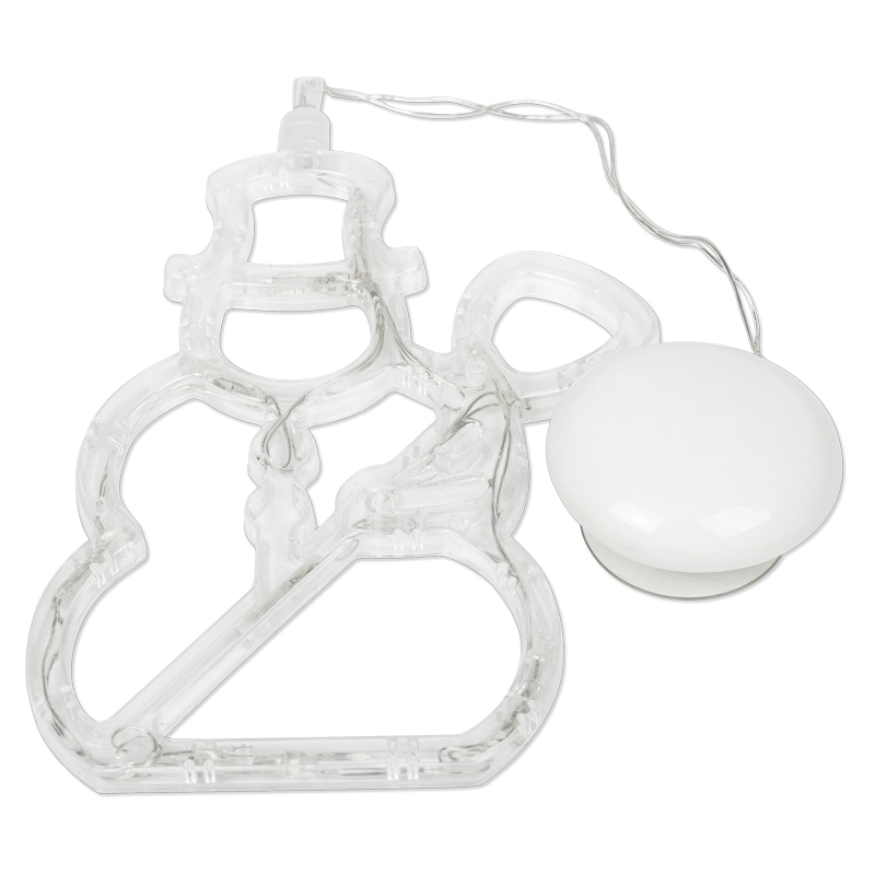 Светодиодная фигура «Снеговик» — эффектное интерьерное украшение, которое можно разместить на любой гладкой поверхности, как вертикальной, так и горизонтальной. Присоска, прочно фиксирующая изделие, находится на батарейном блоке, отделенном от основной фигуры проводом длиной 20 см. 8 светодиодов находятся внутри прозрачной трубки из ПВХ. Экономичные, безопасные диоды излучают теплый белый свет и не нагревают конструкцию. Интерьерная фигура питается от 3 мизинчиковых батареек (тип ААА), что делает ее мобильной и безопасной. Батарейки в комплект не входят.