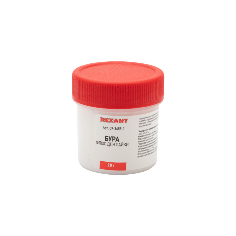 Температура пайки: +700...+900 °C. Температура наибольшей активности: +800...+1150 °C. Вариант фасовки – банка с крышкой, вес нетто 20 г. Состав: натриевая соль тетраборной кислоты.