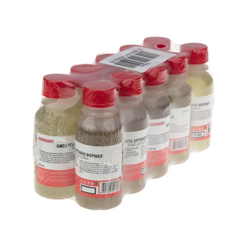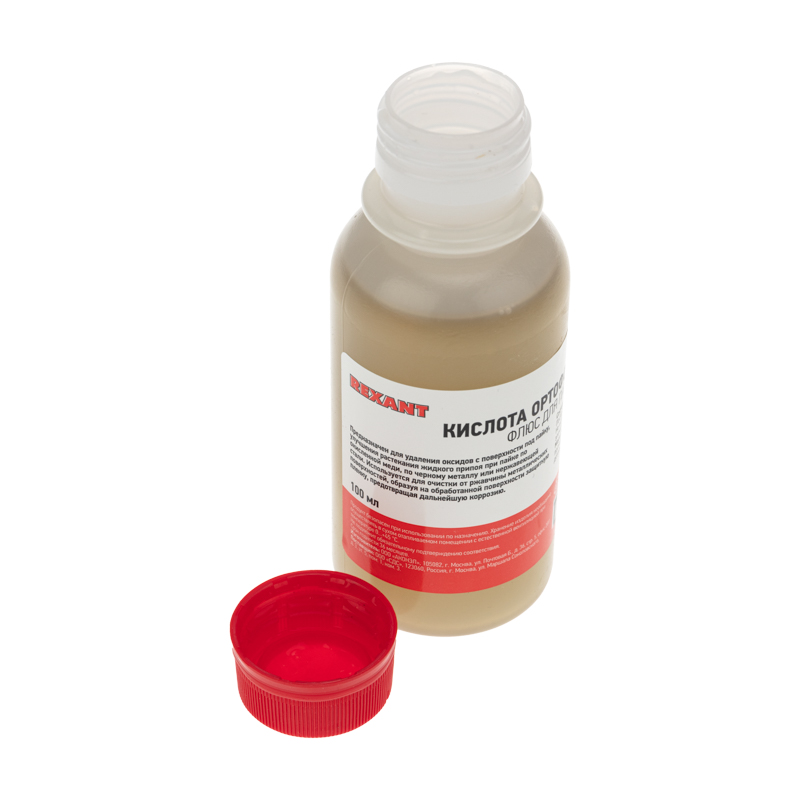 Ортофосфорная кислота REXANT предназначена для удаления оксидов с поверхности под пайку, улучшения растекания жидкого припоя при пайке окисленной меди, нержавеющей стали, черных или цветных металлов. Изготовлена в соответствии с ГОСТ 10678-76. Применяется в качестве флюса при пайке или лужении деталей низкотемпературными припоями. Также используется для очистки от ржавчины металлических поверхностей, образуя защитную пленку и предотвращая образование коррозии.