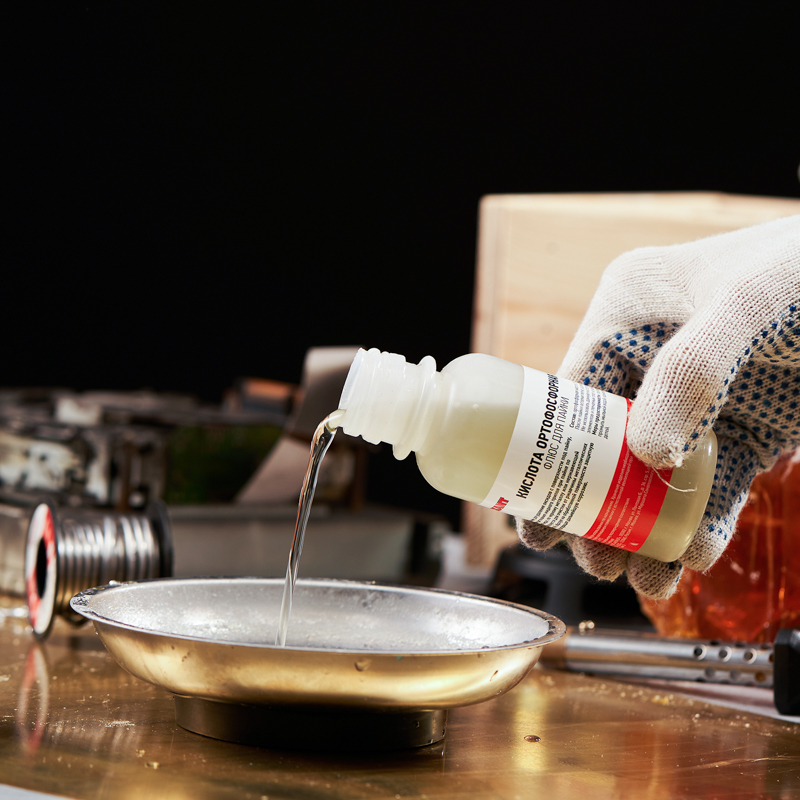 После завершения паяльных работ остатки флюса необходимо удалить водой. Не рекомендуется использовать данную кислоту при пайке высокочастотных элементов, печатных плат и прочих контактов из-за кислотности остатков, так как есть риск разъедания материала.