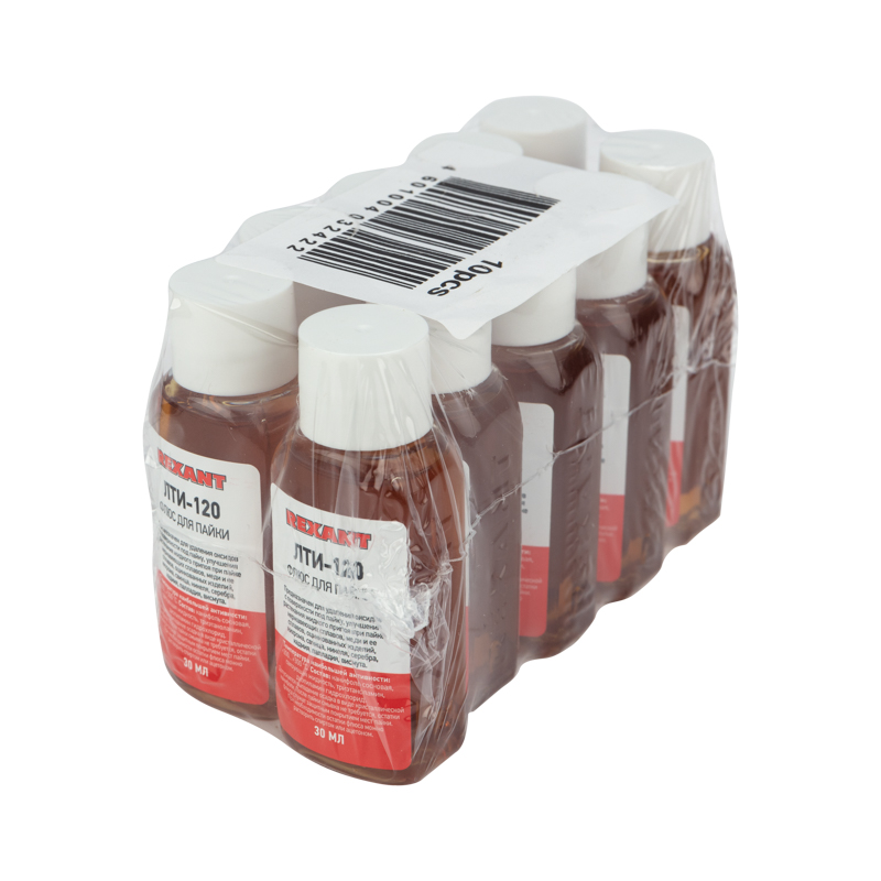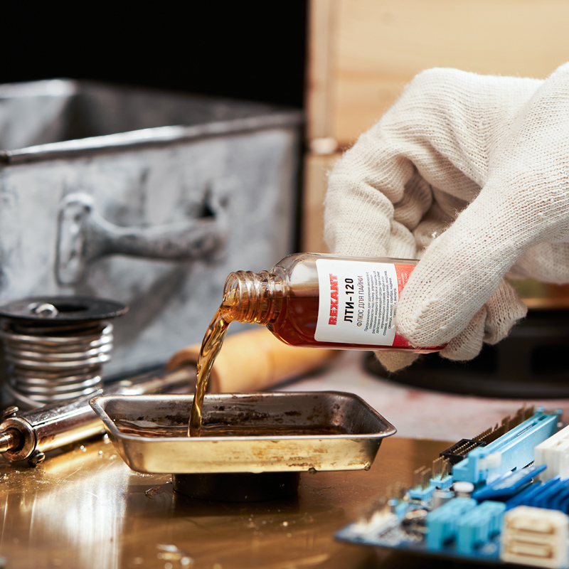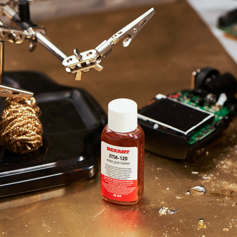 Флюс ЛТИ-120 REXANT предназначен для удаления оксидов с поверхности под пайку, улучшения растекания жидкого припоя и защиты нержавеющих сплавов, меди и ее сплавов, оцинкованных изделий, нихрома, свинца, никеля, серебра, кадмия, палладия, висмута от воздействия окружающей среды. Изготовлен в соответствии с ТУ 84-406-73.