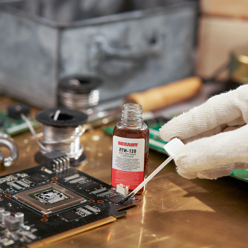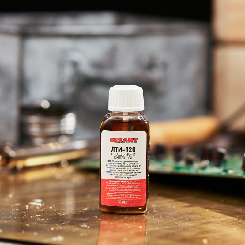 Флюс ЛТИ-120 REXANT предназначен для удаления оксидов с поверхности под пайку, улучшения растекания жидкого припоя и защиты нержавеющих сплавов, меди и ее сплавов, оцинкованных изделий, нихрома, свинца, никеля, серебра, кадмия, палладия, висмута от воздействия внешней среды. Изготовлен в соответствии с ТУ 84-406-73.