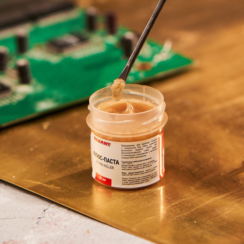 Основные компоненты: канифоль, технический вазелин и активаторы. Вариант фасовки – банка объемом 20 мл.