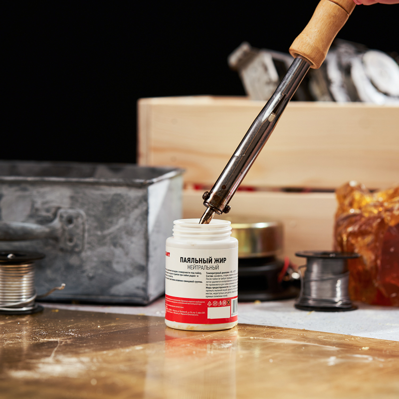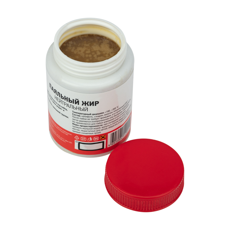 Нейтральный паяльный жир предназначен для удаления оксидов с поверхности под пайку, улучшения растекания жидкого припоя при пайке радио- и электротехнических устройств. Преимущественно используется для пайки токопроводящих деталей телефонной, радио- и электронной аппаратуры. Не применяется для пайки алюминия и его сплавов. Изготовлен в соответствии с ГОСТ 19250-73.