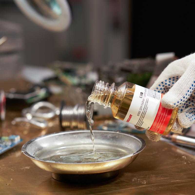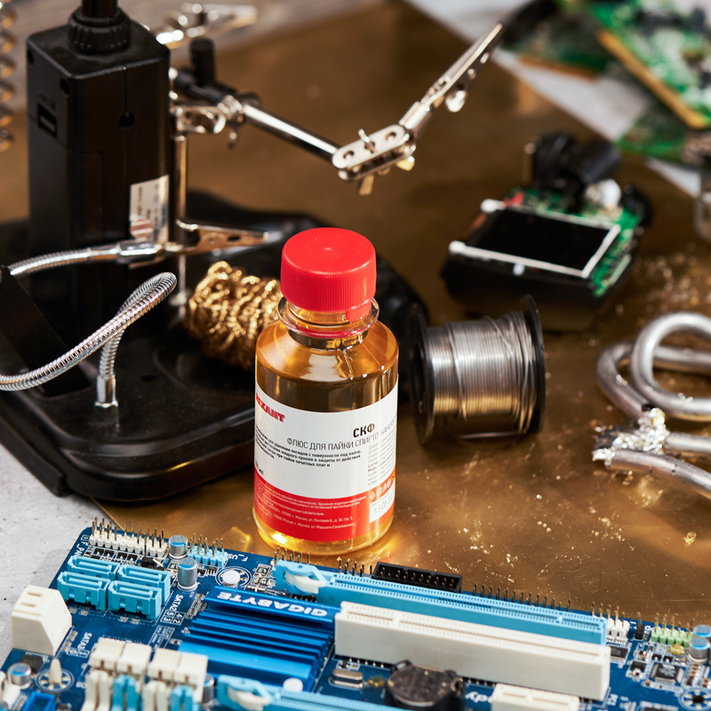 Флюс СКФ (спирто-канифольный) REXANT предназначен для удаления оксидов с поверхности под пайку, улучшения растекания жидкого припоя и защиты от действия окружающей среды при пайке печатных плат и радиокомпонентов. Наиболее эффективен при работе с медью и ее сплавами. Изготовлен в соответствии с ОСТ 4Г 0.033.200. Часто используется для ремонта радиоаппаратуры.