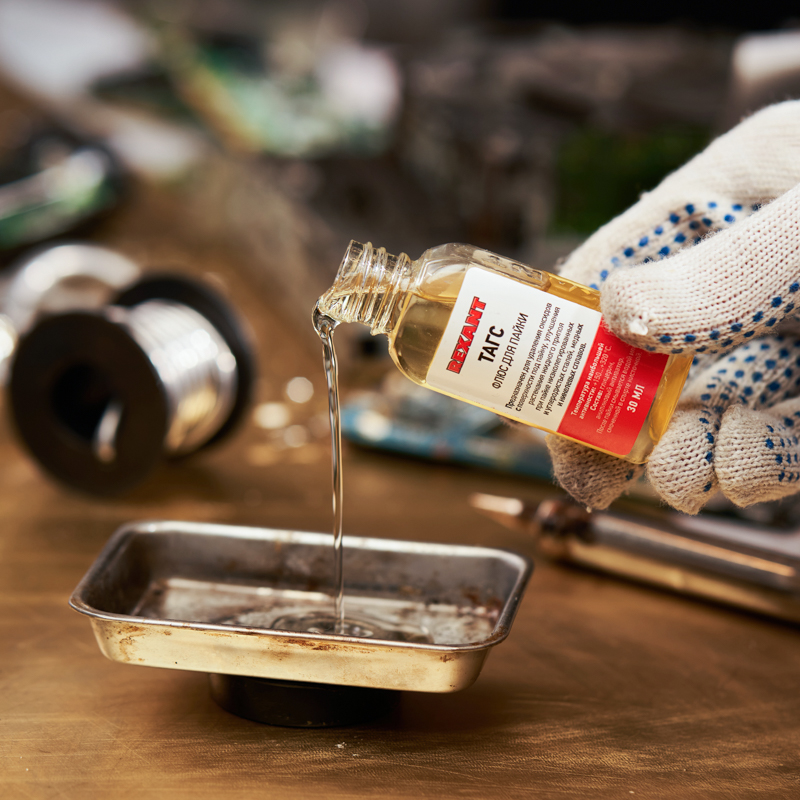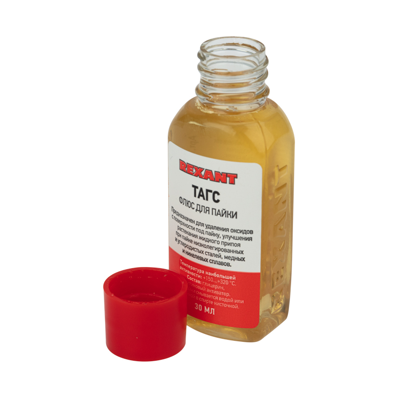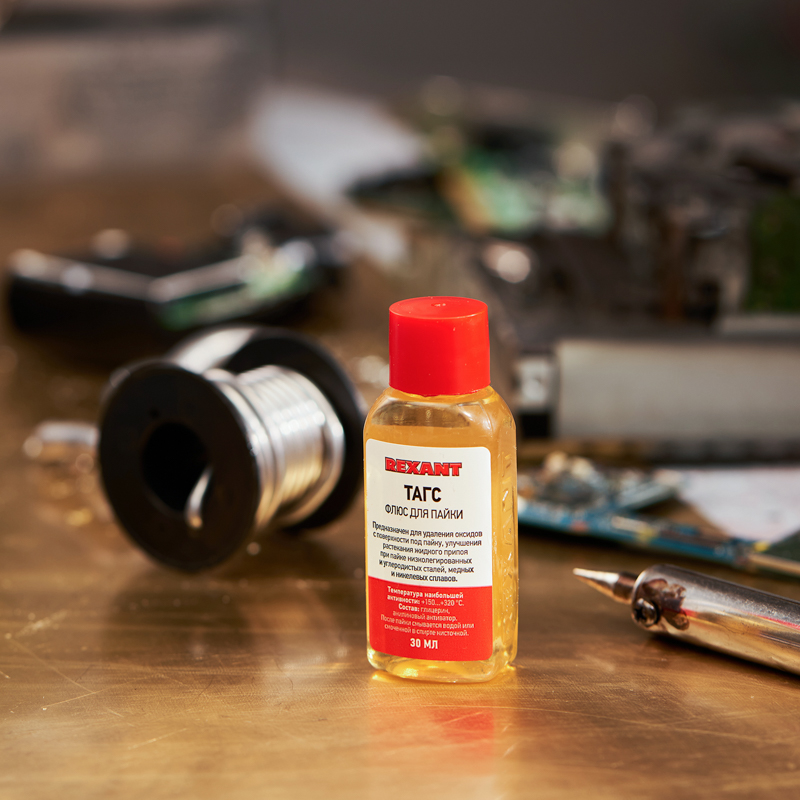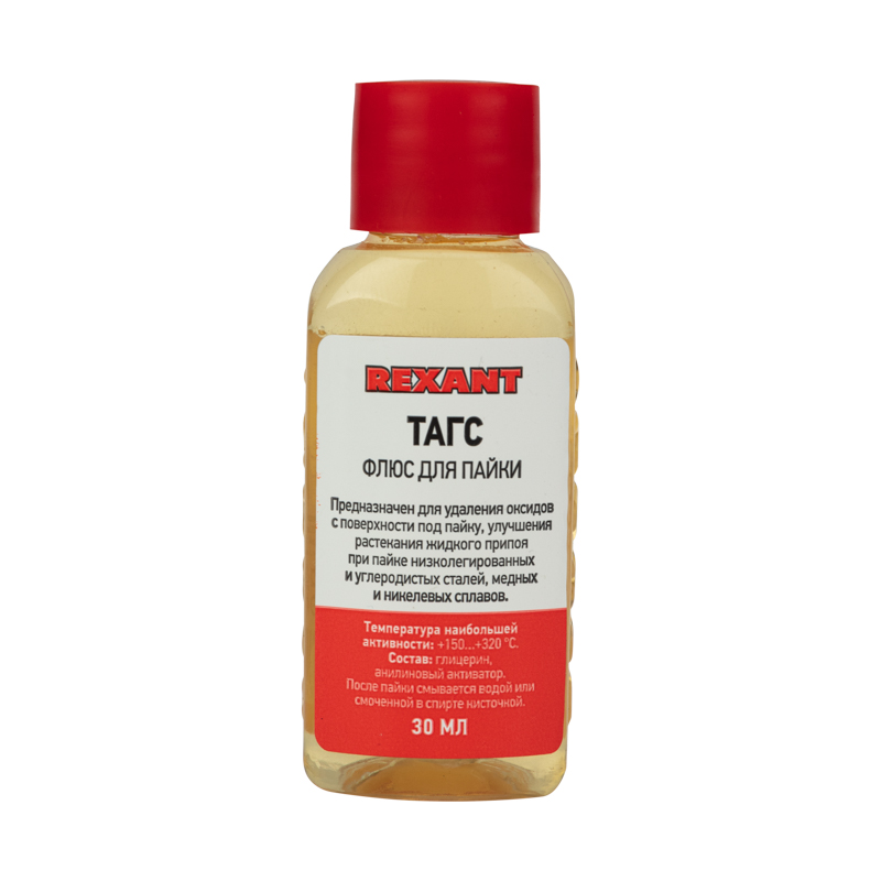 Флюс ТАГС REXANT предназначен для удаления оксидов с поверхности под пайку, улучшения растекания жидкого припоя при пайке печатных плат и элементов радиомонтажа, а также низколегированных и углеродистых сталей, сплавов с медью и никелем. Относится к низкотемпературным флюсам и применяется при пайке оловянно свинцовыми припоями. Является пожаро- и взрывобезопасной продукцией.