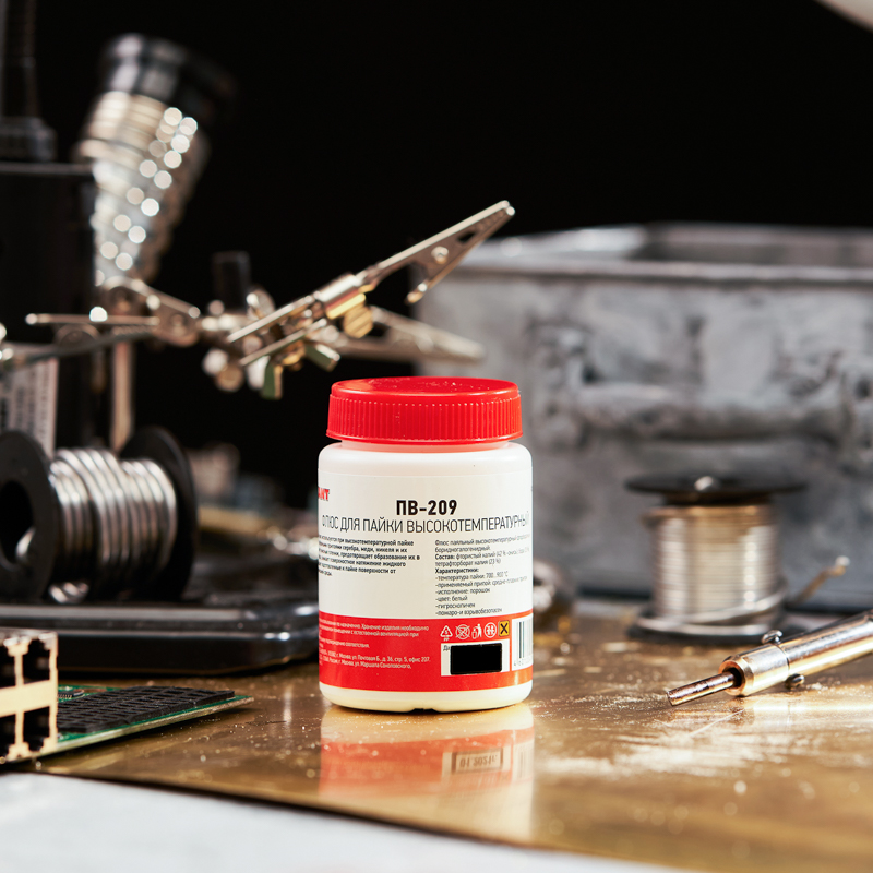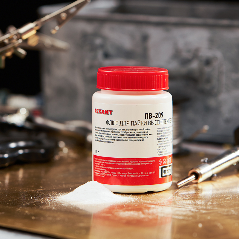 Флюс для пайки порошковый ПВ-209 используется при высокотемпературной пайке серебра, меди, никеля и их сплавов. Позволяет удалить окисные пленки и предотвратить их образование в процессе нагрева. Применение флюса уменьшает поверхностное натяжение жидкого припоя и защищает металл в зоне пайки от внешних факторов. Изготовлен в соответствии с ГОСТ 23178-78.