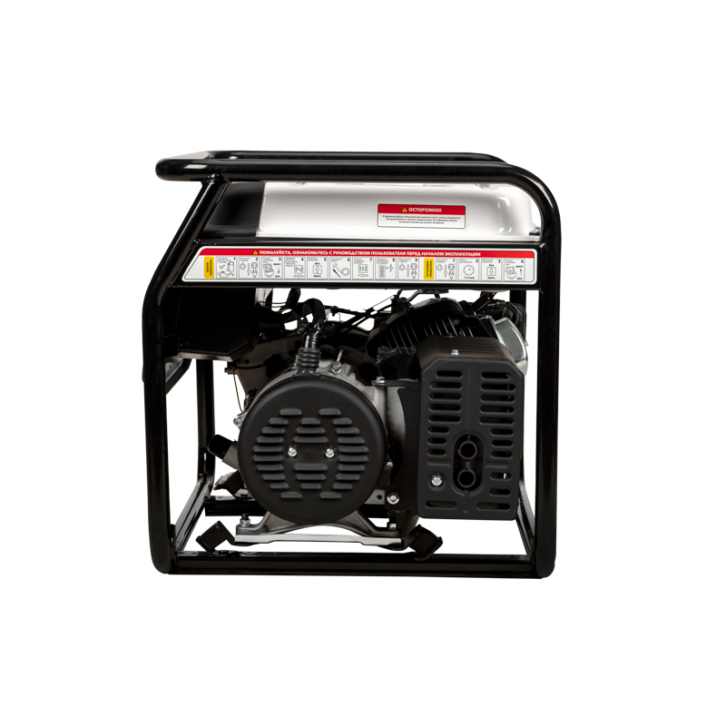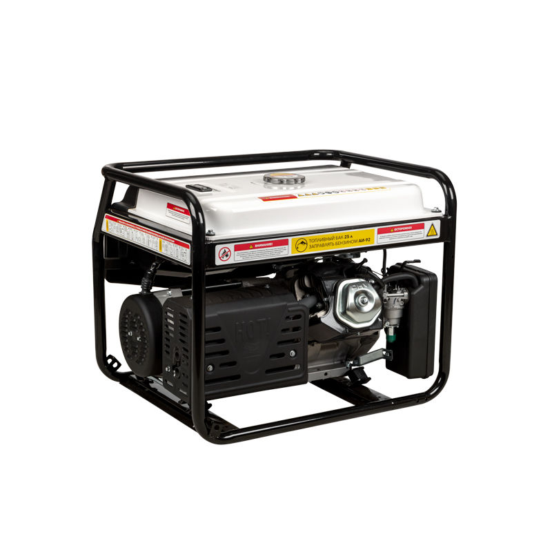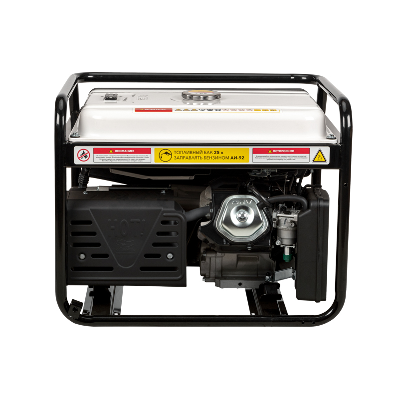 Увеличенный бензобак 25 л гарантирует до 7-8 часов работы. Стальная рама диаметром 32 мм для установки ручек и колес защищает внутренние детали от повреждений. Система поддержания параметров выходного напряжения (AVR) обеспечивает стабильное питание.