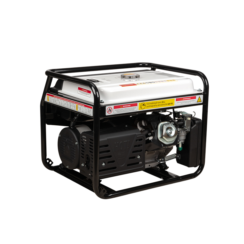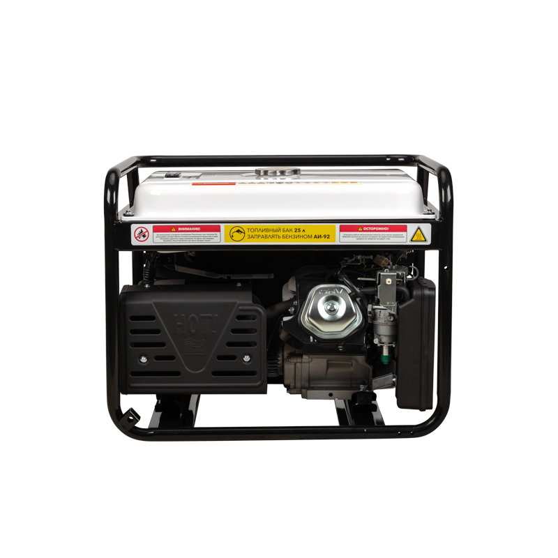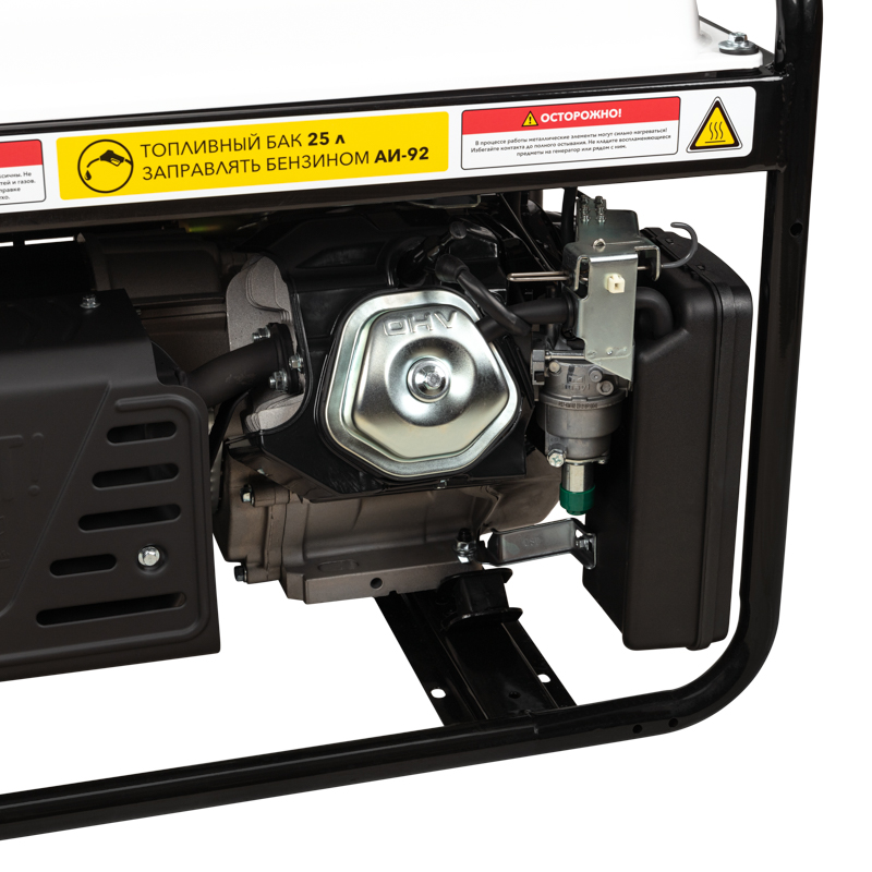 Увеличенный бензобак 25 л гарантирует 7-8 часов работы. Стальная рама диаметром 32 мм для установки ручек и колес защищает внутренние детали от повреждений. Система поддержания параметров выходного напряжения (AVR) обеспечивает стабильное питание.