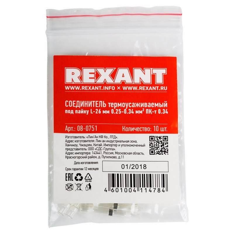 Соединитель термоусаживаемый под пайку (L-26 мм) 0.25-0.34 мм² белый REXANT предназначен для соединения медных многопроволочных проводов внахлест или встык методом термообработки.