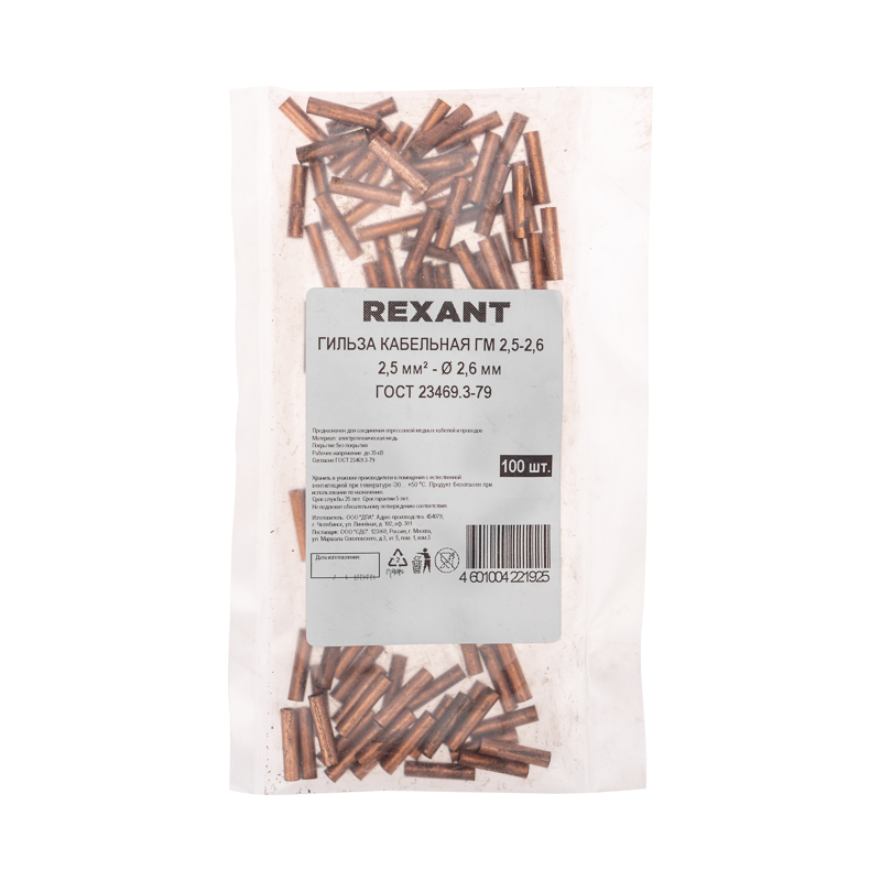 Кабельная гильза ГМ 2,5-2,6 (2,5мм² - Ø2,6мм) REXANT предназначена для оконцевания проводов и кабелей с медными жилами методом опрессовки. Обеспечивает защиту кабелей от воздействия внешних факторов, таких как влага, пыль, химические вещества и механические повреждения.