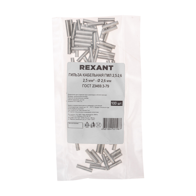 Медная луженая гильза ГМЛ 2,5-2,6 (2,5 мм² - Ø 2,6 мм) REXANT применяется для оконцевания проводов или кабелей с медными жилами путем опрессовки.