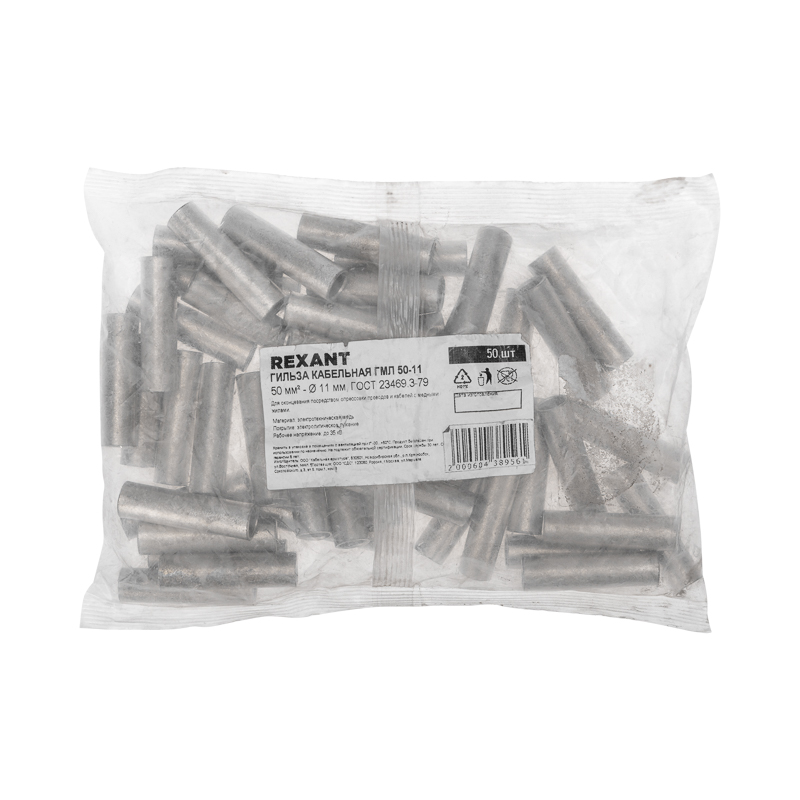 Медная луженая гильза ГМЛ 50-11 (50 мм² - Ø 11 мм) REXANT применяется для оконцевания проводов или кабелей с медными жилами путем опрессовки.