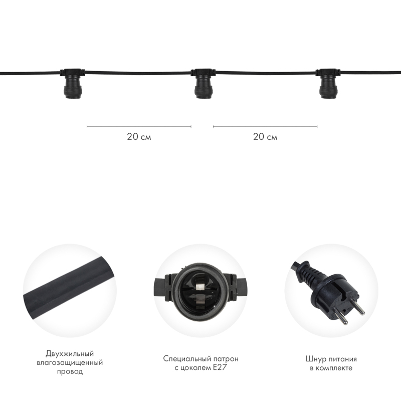 Данная гирлянда имеет 2 жилы. Расстояние между патронами 20 см.
