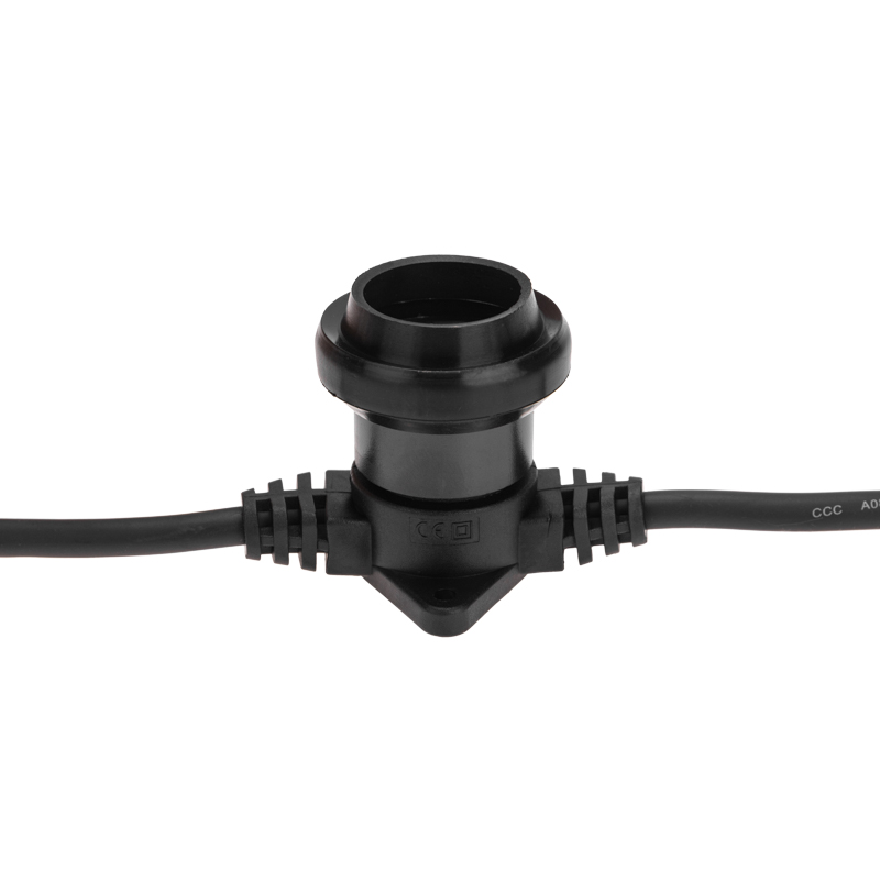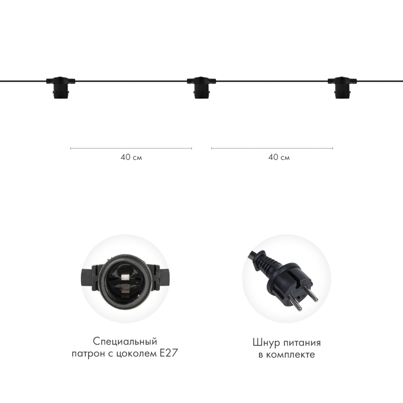 На двужильном проводе гирлянды располагаются 125 патронов с цоколем Е27 на расстоянии 40 см друг от друга.