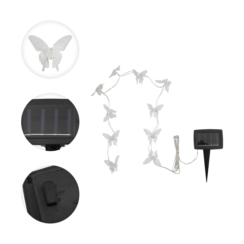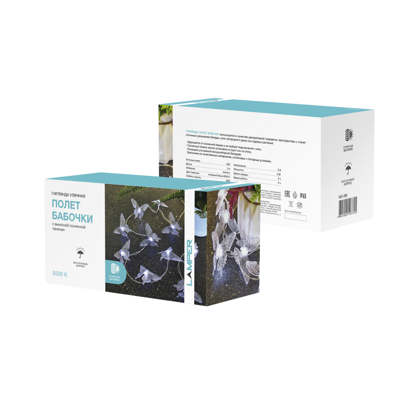 Устройство не требует прокладки проводов и дополнительных элементов установки. 10 пластиковых бабочек и солнечная панель расположены на шнуре длиной 3 м. Так, гирлянда легко крепится в любом месте. При этом панель незаметно размещается по соседству. Ее можно положить на плоскую поверхность или вставить в грунт (в комплекте идет прочный пластиковый колышек). Каскад имеет высокий уровень пыле- и влагозащиты IP65, поэтому может использоваться в непогоду без навеса.