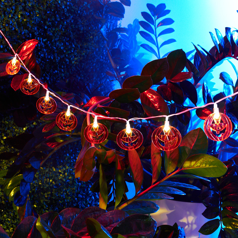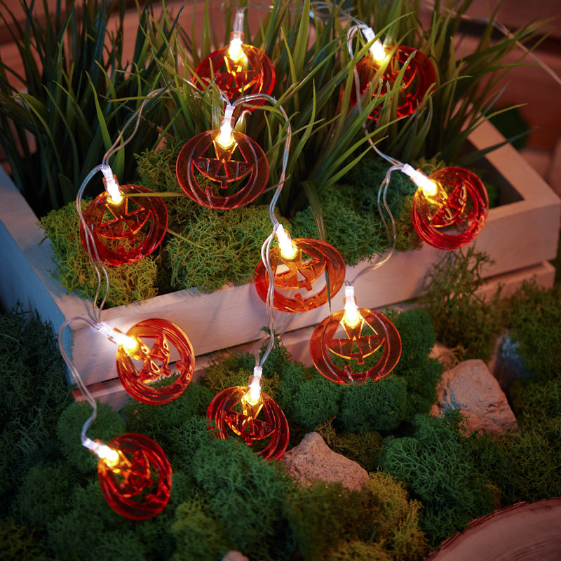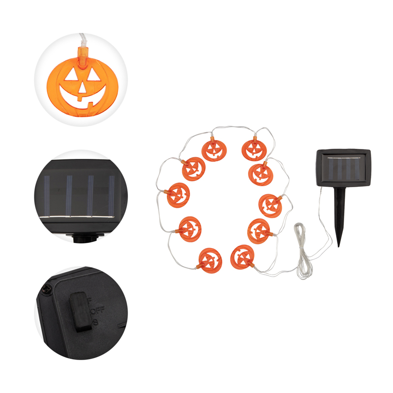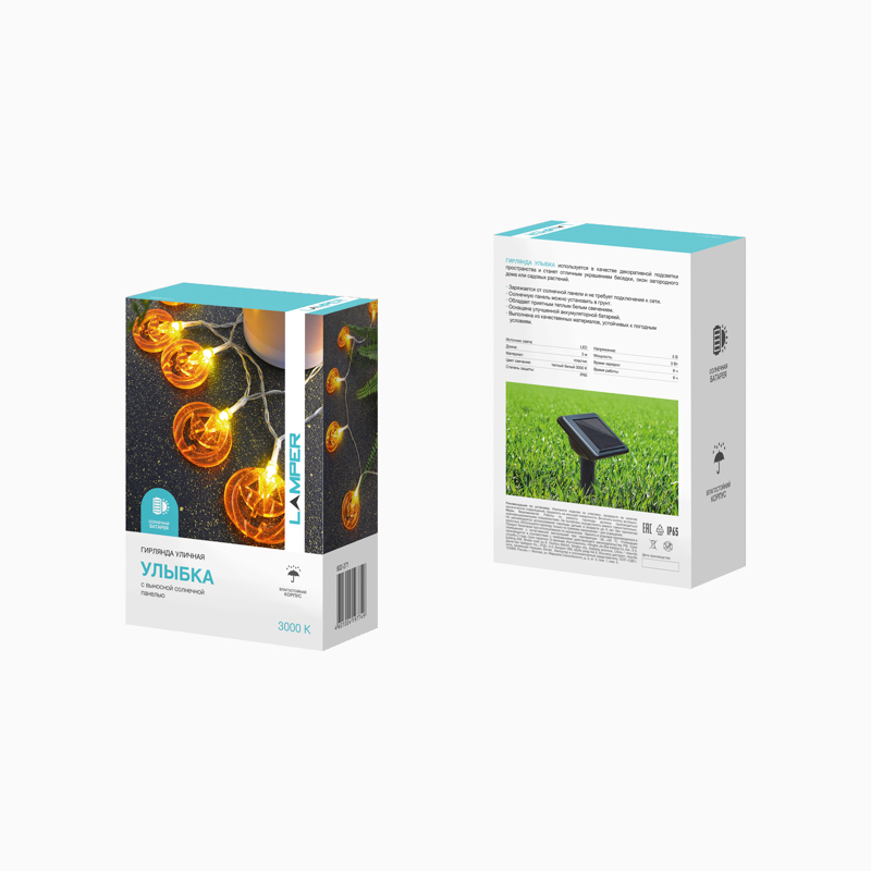 Устройство не требует прокладки проводов и дополнительных элементов установки. 10 пластиковых улыбающихся тыкв расположены на шнуре длиной 3 м. Так, гирлянда легко крепится в любом месте. При этом панель незаметно размещается по соседству. Ее можно положить на плоскую поверхность или вставить в грунт (в комплекте идет прочный пластиковый колышек). Каскад имеет высокий уровень пыле- и влагозащиты IP65, поэтому может использоваться в непогоду без навеса.